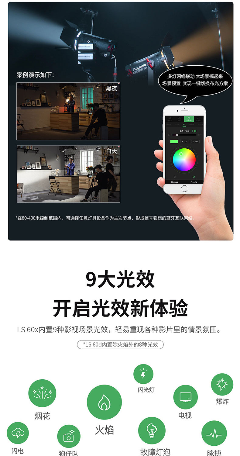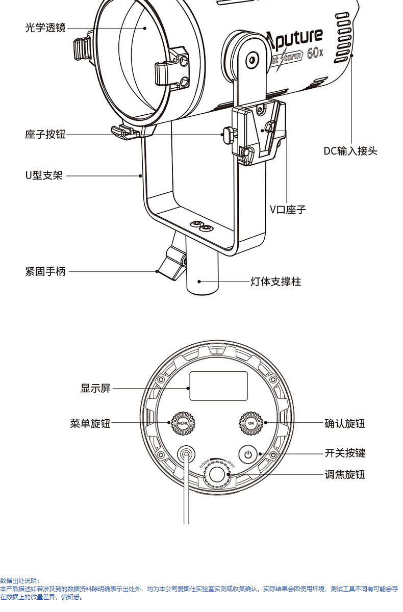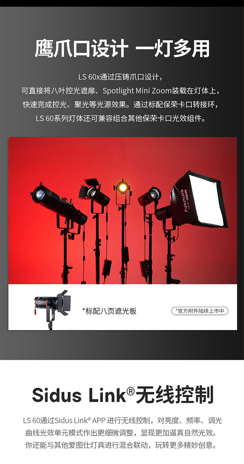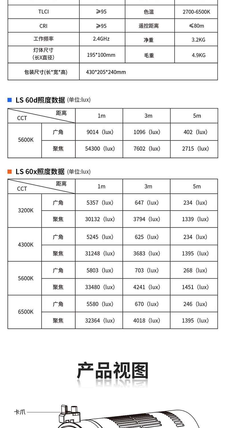 The Aputure LS 60d is a series of light storm brand new design with its own optical system lamps. The lamp integrates a new lens design to greatly improve the optical quality and texture of low-power light sources. Compact structure design, metal lamp body, excellent texture.IP64 level waterproof design, to meet more severe use scenarios.