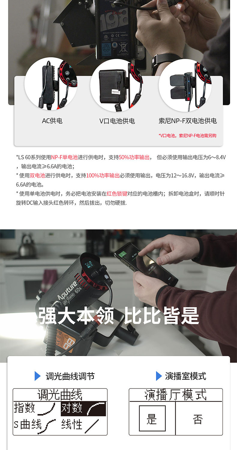 Benefits:Power offers yet more options. You can use the 60x worldwide thanks to its 110 to 240V adapter but it will also run on one or two NP-F-type batteries or a V-mount battery in situations where AC current is unavailable.The LS 60x is also IP54 weatherproof (dust and water resistant), so it is built to withstand any shooting environment. It is compatible with a the separately-sold custom Bowens Mount adapter and Spotlight Mini Zoom lens. Among its other impressive features are nine built-in lighting effects including Paparazzi, Fireworks, Lightning, Faulty Bulb, TV, Pulsing, Strobe, Explosion, and Fire.