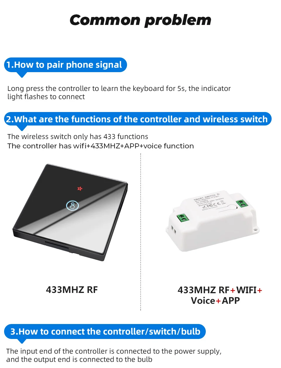 1. Для радиочастотного передатчика требуется часть CR2032, батарея не входит в посылка. 2. Высокочувствительный дизайн, дизайн ящика, Флуоресцентный светильник, защита от падения, большая панель и т. д. 3. Беспроводной переключатель не имеет функции WIFI, только функция RF433MHZ 4. Контроллер имеет WIFI + RF433MHZ + Приложение + голосовую функцию 5. Есть проблема с продуктом, не волнуйтесь, мы повторно выдадим новый продукт. (Сначала свяжитесь со службой поддержки клиентов и отправьте достаточно видео доказательства проблемы)