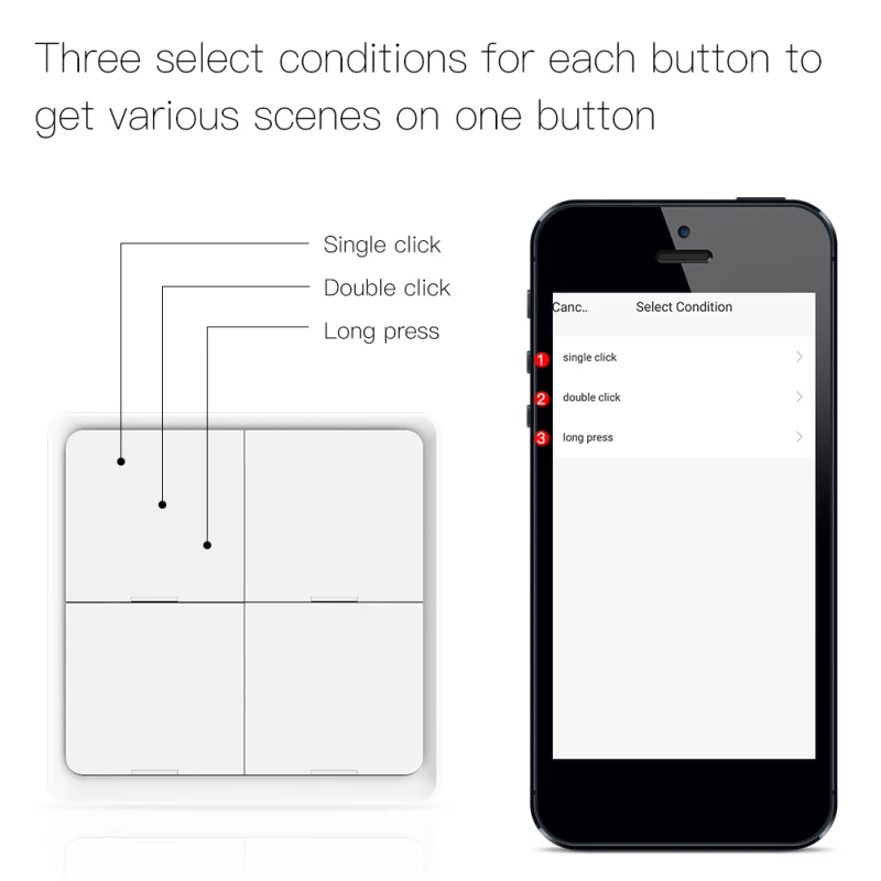 2. Три режима сопряжения для каждой кнопки, такие как режим вдали, домашний режим, режим кино и т. д. Чтобы создать любую интеллектуальную автоматизацию, как вы хотите в вашем смартфоне, чтобы начать другой Интеллектуальный образ жизни, больше нет голосовой команды, нет больше времени, чтобы открыть приложение, требуется только одно касание, когда вы устали от однодневной работы.