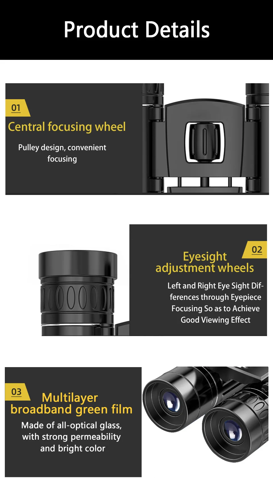 1. Водонепроницаемость, что может лучше продлить срок службы телескопа. Легко справиться с любой суровой средой. 2. Призма BAK4 и многослойная линза для улучшенной светопроницаемости и четкости изображения. 3. Центральная Ручка фокусировки для плавной работы. 4. Широкополосное зеленое пленочное покрытие для увеличения светильник проницаемости и увеличения цветопередачи изображений. 5. Легкий и компактный, подходит для кемпинга, пеших прогулок, концертов, наблюдения за птицами, охоты, путешествий, гольфа, спортивных мероприятий и других видов активного отдыха.