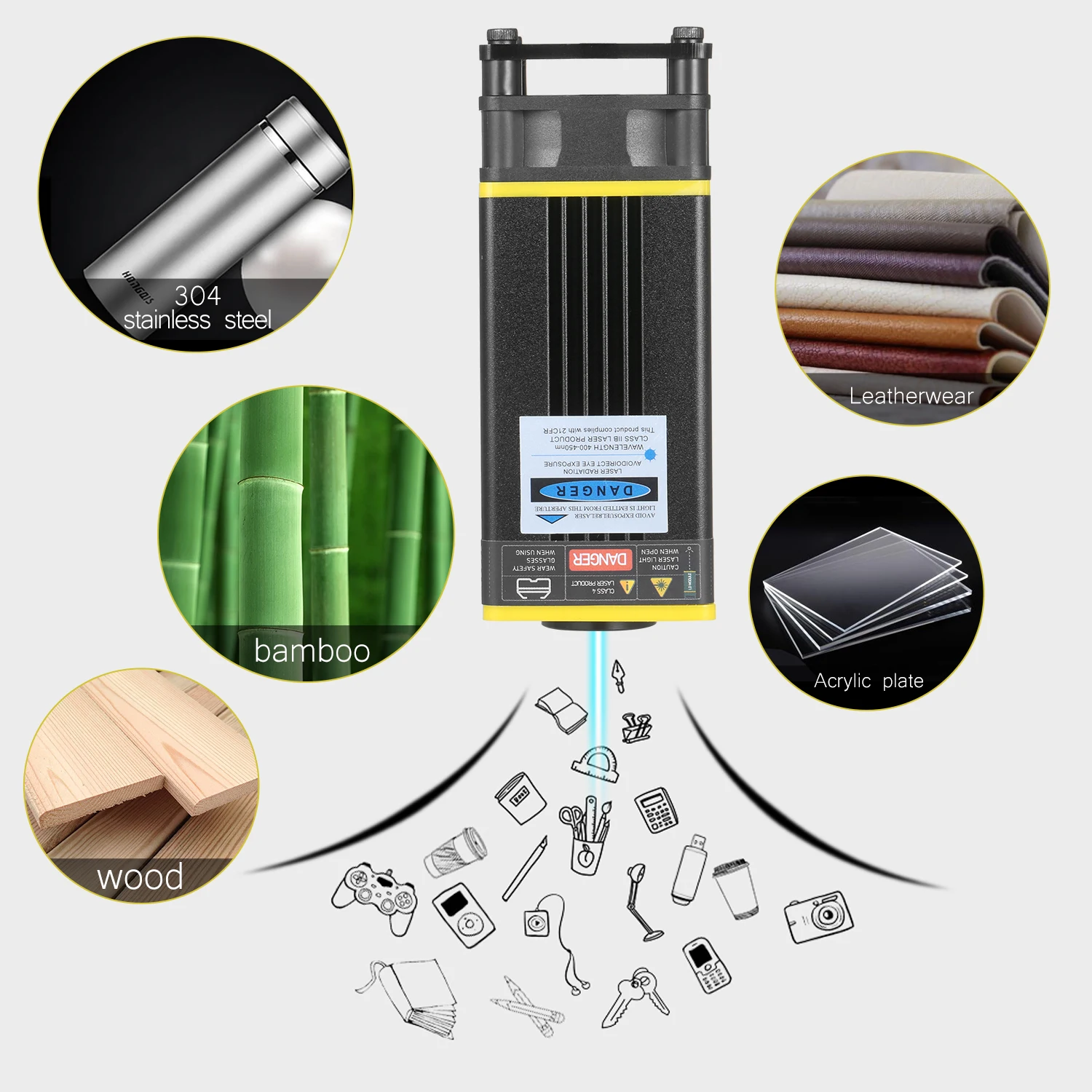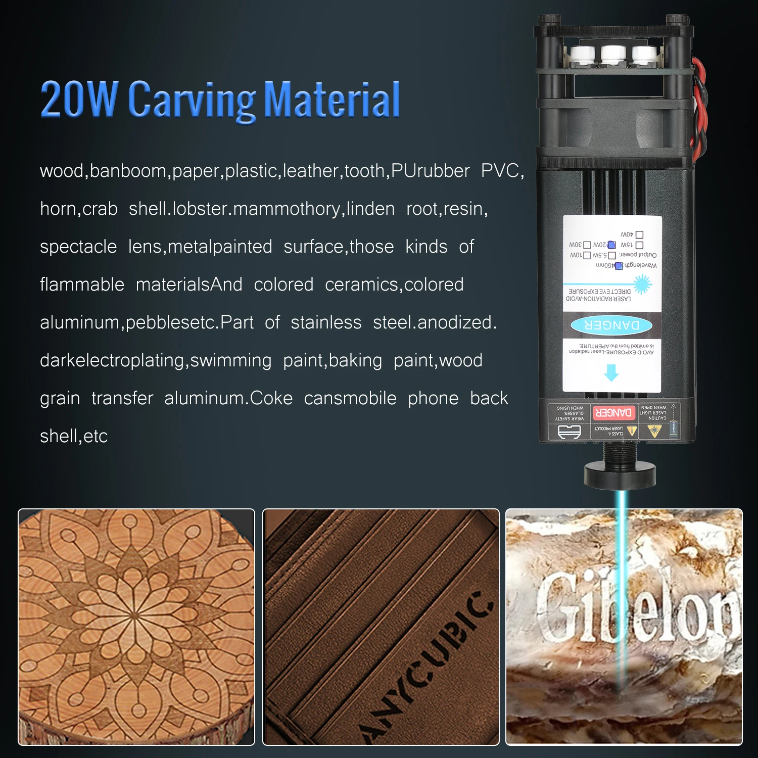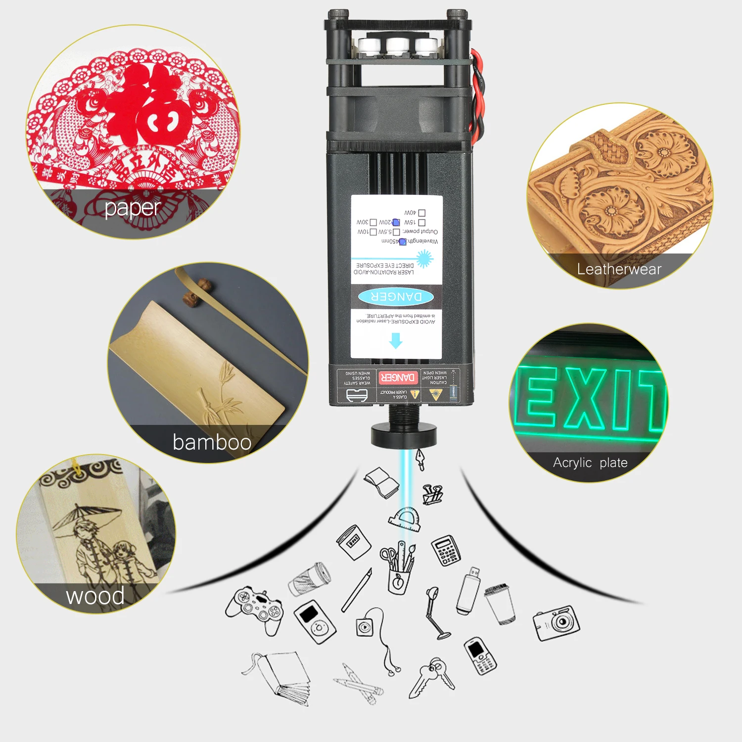 40 Вт резной материал-он может гравировать 201/304 нержавеющую сталь, титановую сталь и анодированный алюминий, камень, МДФ, балса, дерево, ткань, пластик, печатная плата, бумага, бамбук, рог, кожа, губчатая бумага и т. Д. Не гравируется: медный ворс Материал s, алюминиевый ворс Материал s.