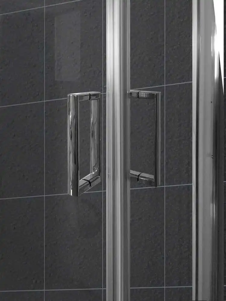 Угловой душевой экран, с двумя фиксированными кристаллами и двумя раздвижными дверями у vertex. Высота 195 см, толщина кристалла 5 мм, прозрачная. Профилирование по всей своей конструкции из нержавеющей стали с серебряным блеском.