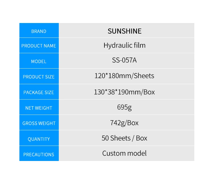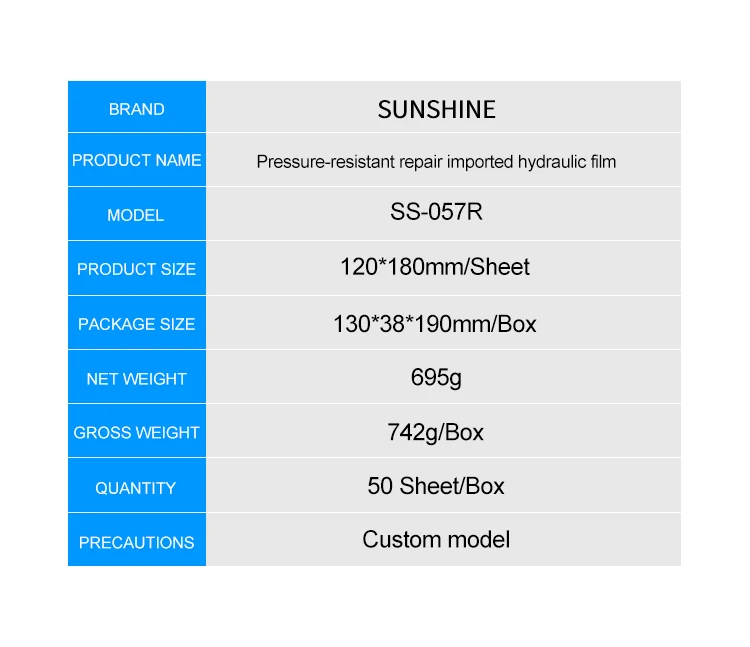 Примечание:SS-057 импортированный гибкий гидравлический пленки (50 шт./кор.)SS-057A внутренний гибкий гидравлический пленки (50 шт./кор.)SS-057B с защитой от УФ-светильник импортированный гибкий гидравлический пленки (50 шт./кор.)SS-057E матовый импортированный гибкий гидравлический пленки (50 шт./кор.)SS-057RКомпрессионный ремонтГибкий гидравлический пленки (50 шт./кор.)SS-057H HD гибкий гидравлический пленки (50 шт./кор.)