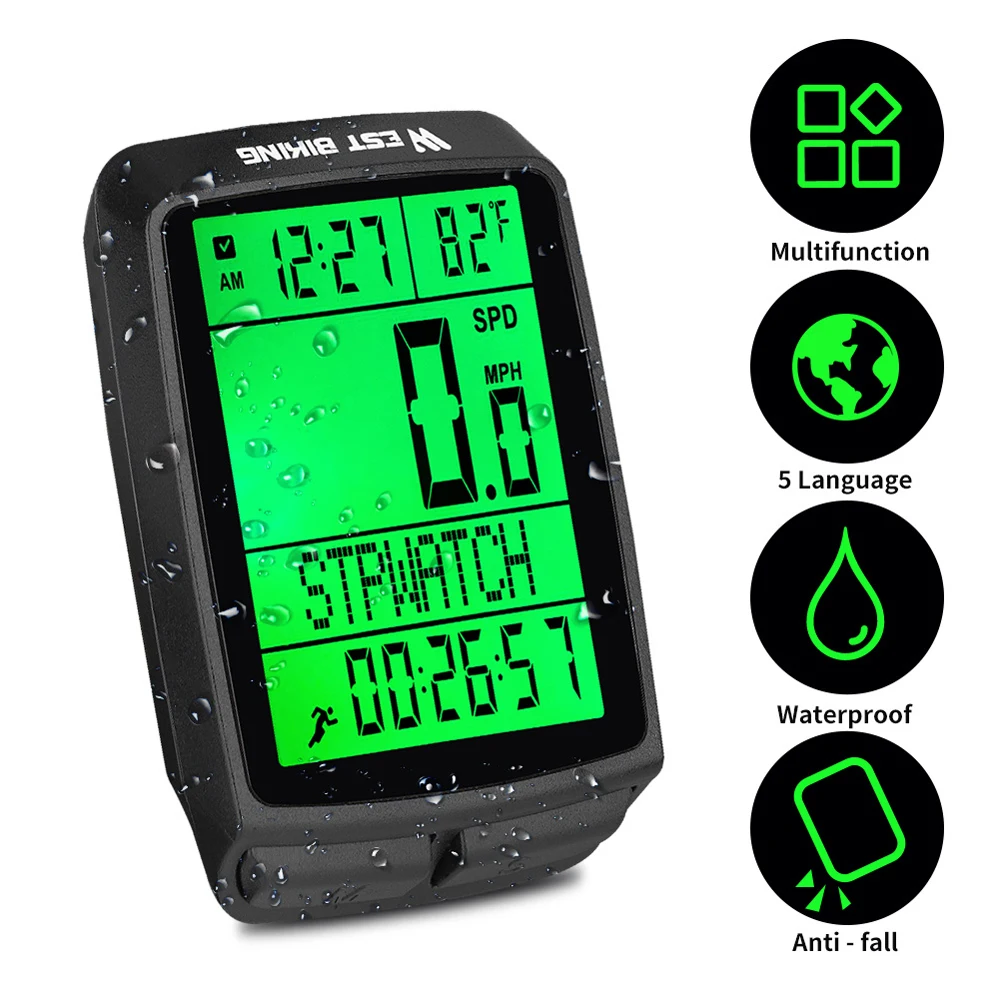 Этот велосипедный секундомер доступен на пяти языках. Он Многофункциональный и может отображать множество данных, таких как скорость езды и расстояние. Водонепроницаемый, легко устанавливается и легко переносится.