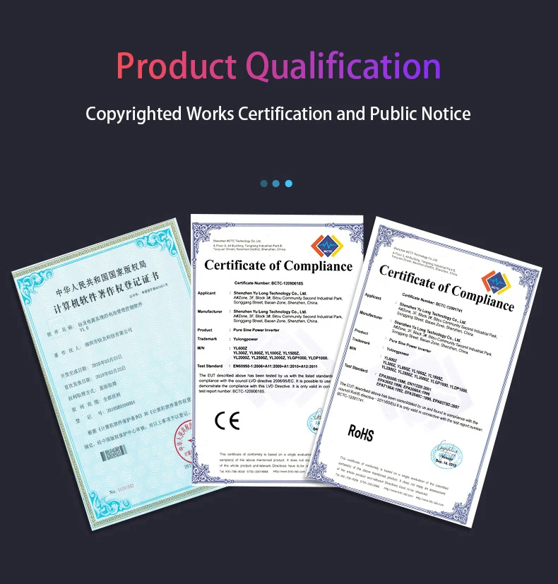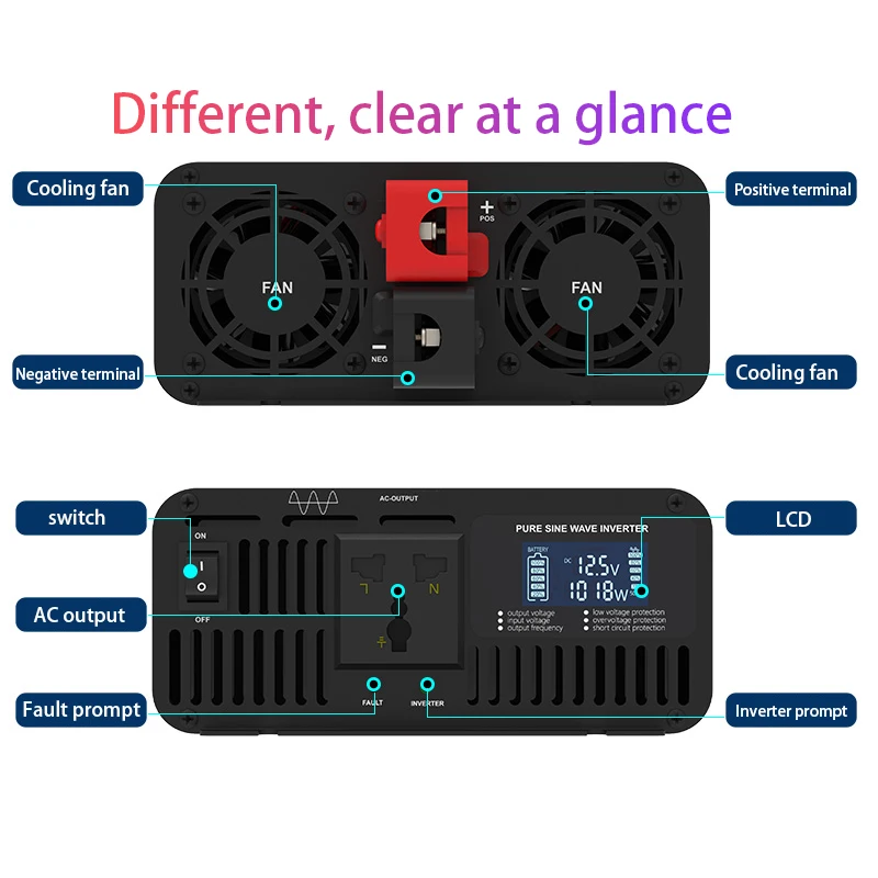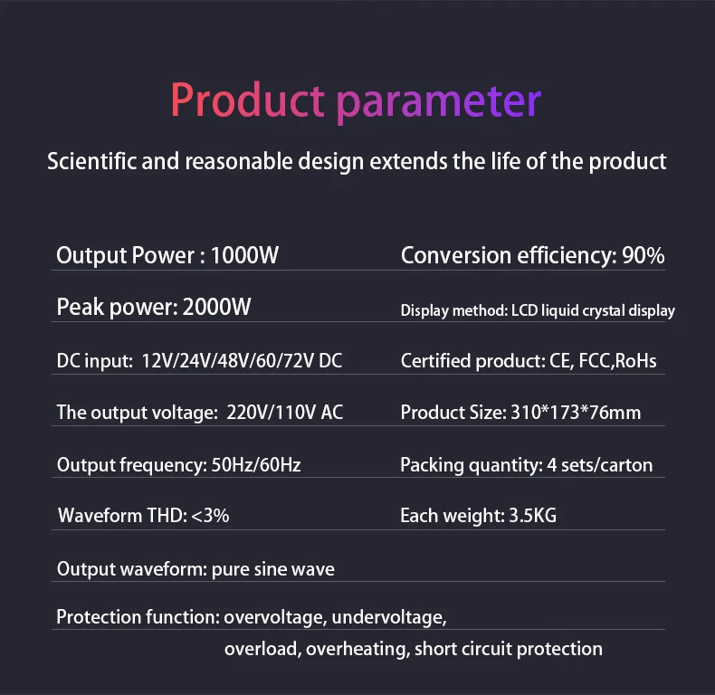 Использование окружающей среды Установите инвертор в соответствии с требованиями местной мощности. Место установки должно быть сухим, чистым и хорошо проветриваемым. Рабочая температура:-30 ° до 60 ° Температура хранения:-10 ° до 40 ° Относительная влажность: от 0% до 90%, без конденсации Охлаждение: принудительная вентиляция Защитная функция (1) Сигнализация низкого напряжения: звуковой сигнал 2 звуковой сигнал с зазором 1 Гц. (2) Защита от низкого напряжения: зуммер непрерывно издает сигнал тревоги 3 времени, с зазорами 1 Гц (3) восстановление низкого напряжения: низкое напряжение автоматически восстанавливает выход, и звуковой сигнал 3 раза отменяется. (4) защита от перенапряжения: звуковой сигнал 4 раза с зазором 1 Гц. (5) восстановление перенапряжения: напряжение автоматически уменьшается, чтобы восстановить выход, и звуковой сигнал в 4 раза отключается. (6) Тепловая защита: 80 ° ± 5 °, при перегреве звуковой сигнал 5 раз, с зазором 1 Гц (7) защита от перегрузки: 10s автоматическое выключение выход для защиты от перегрузки, 5s автоматическое восстановление, автоматическая блокировка три раза подряд (8) защита от короткого замыкания: защита от короткого замыкания на выходе 1s Блокировка отключения.