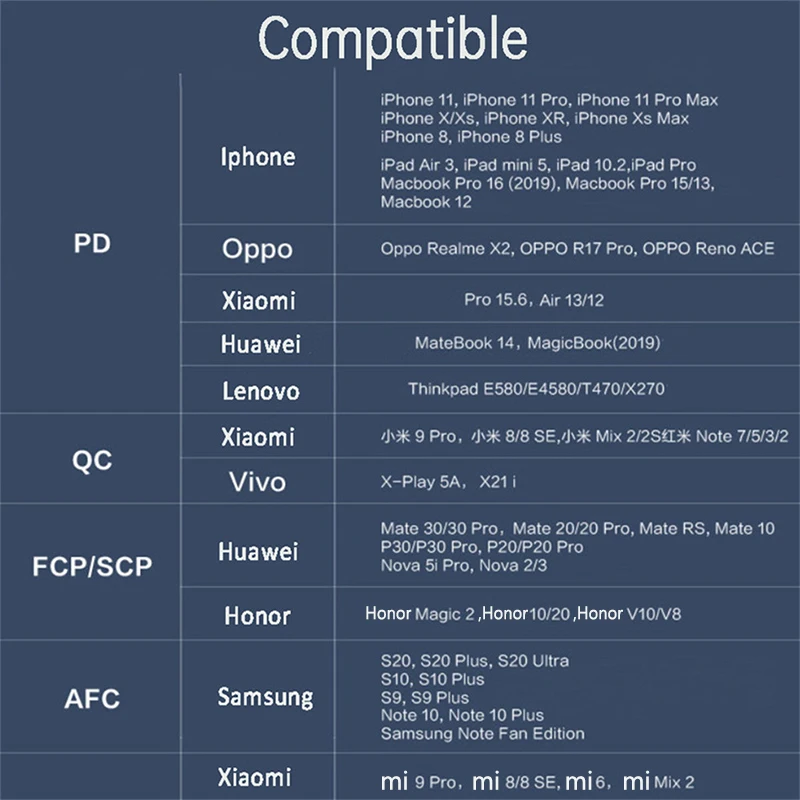 Подходит для быстрой зарядки Apple PD, iphone SE / 11 / X 18 Вт Xiaomi / Samsung (QC3.0 / AFC), Meizu PE2.0/3,0 и других мобильных телефонов с быстрой зарядкой, apple 2.4A iphone 5 /6 / 7...