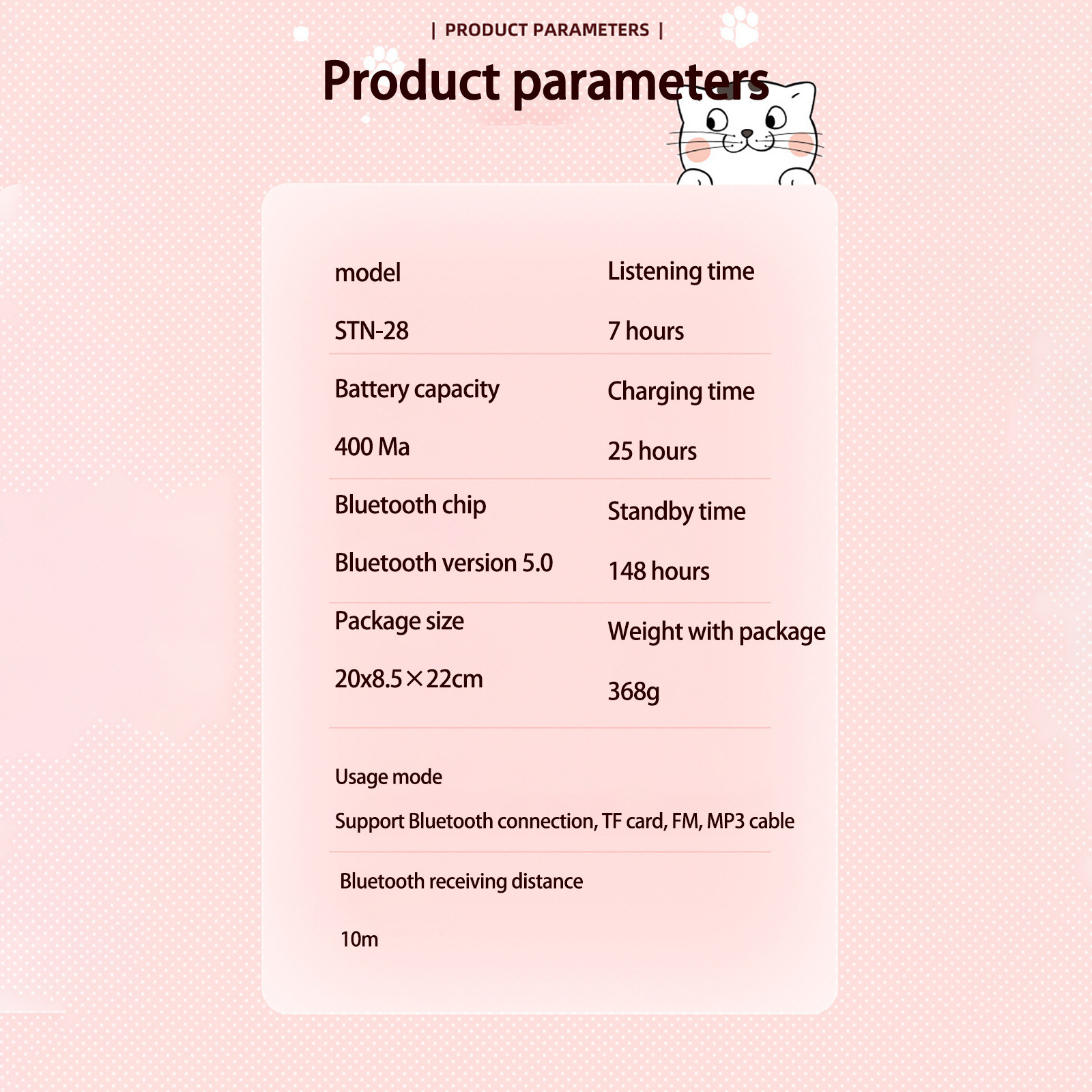 Тип: креативный Оригинальные наушники с кошачьими ушками; Светодиодные наушники Цвет: фиолетовый, розовый, Синий, зеленый, черный Рисунок света: Вспышка Емкость аккумулятора: 400 мА Время прослушивания: 7 ч Время работы в режиме ожидания: 148 ч Время зарядки: 2,5 ч Версия Bluetooth: 5,0 Беспроводное подключение Расстояние: 10 м Материал: АБС-пластик + ПУ Коммуникация: Проводной/беспроводной Тип вилки: линейный тип Разъемы: 3,5 мм Jack Частотный диапазон отклика: 20-2000 ГцПосылка включает в себя: