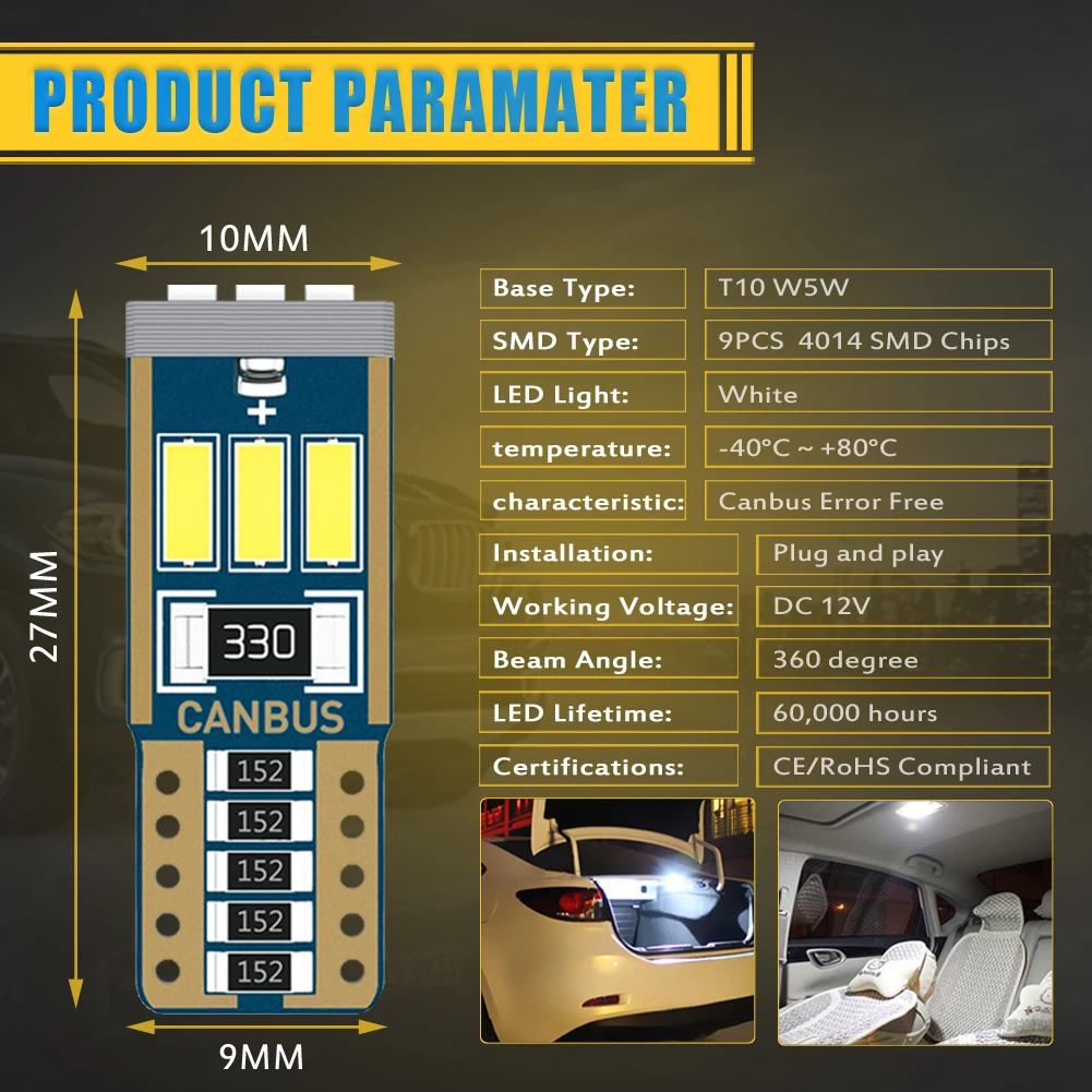 Название: светодиодный светильник T10 Тип СВЕТОДИОДА: 9 шт. 4014 SMD Цвета светодиодов: белый, синий, голубой, красный, оранжевый Срок службы: до более чем 50000 часов Напряжение: DC12V Функция: Canbus, без ошибок, без ошибок