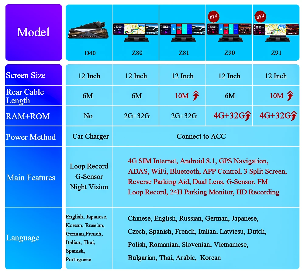 > Android 8,1 + gps-навигация + ADAS + 4G SIM интернет + WiFi + Bluetooth + управление приложением (Хранитель) + 12 дюймов IPS сенсорный Экран + 1080P Запись + Оперативная память 4 ГБ/Встроенная память 32GB + Тройная Экран > Язык: китайский, английский, русский, немецкий, японский, чешский, испанский, французский, итальянский, Латвийский, голландский, польский, румынский, словенский, вьетнамский, болгарский, тайский, арабский, корейский