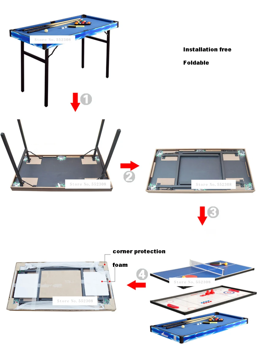 Особенности: 4 функции игры (Бильярд/настольный теннис/Воздушный хоккейный вызов/доска для шаффлеборда)