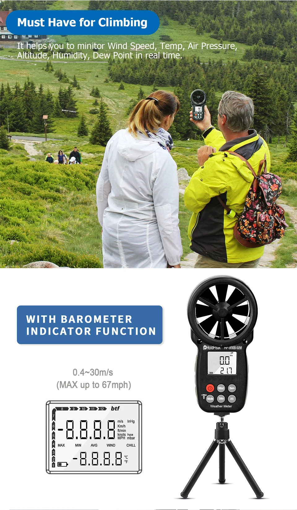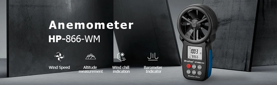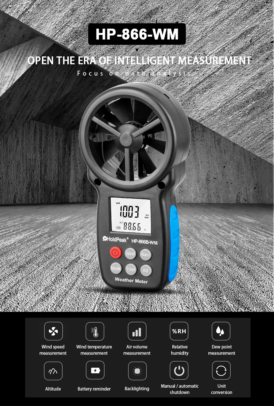 HP-866B-WM вентилятор анемометра, встроенный в датчики температуры и влажности, может использоваться для измерения относительной влажности, точки росы, высоты, скорости ветра.