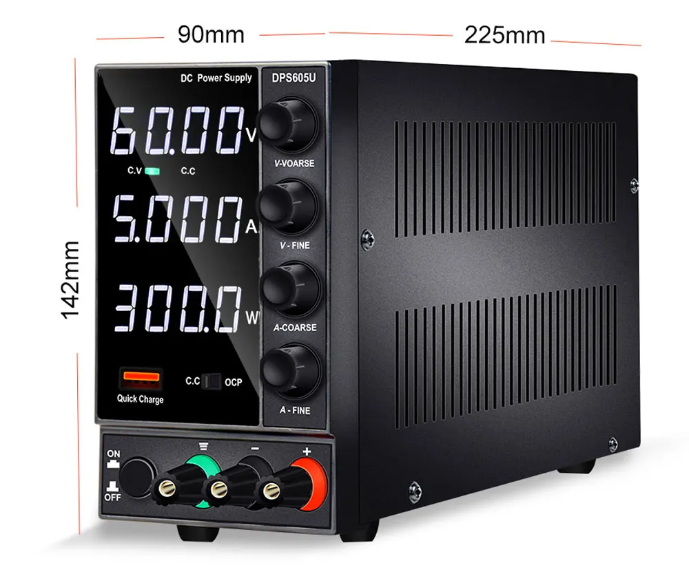 Выходная мощность: 300 Вт Выходное напряжение: 60 в Выходной ток: 5A Рабочая среда: Входное напряжение: 230 В/115 В переменного тока ± 10%;50 Гц/60 Гц Рабочая температура: 0 ℃ ~ 40 ℃; Относительная влажность:<80% RH Температура хранения:-10 ℃ ~ 70 ℃; Относительная влажность:<70% RH Постоянное Напряжение CV: Стабильность напряжения: 0.1% ± 3 мВ Стабильность нагрузки: 0.2% ± 3 мВ Напряжение пульсации: ≤ 0.5% Vp-p От 0 до номинального напряжения постоянно регулируется Постоянный ток CC: Стабильность тока: 0.1% ± 3 мА Стабильность нагрузки: 0.2% ± 3 мА Пульсационный ток: ≤ 0.5% Vp-p Время восстановления: ≤ 500μS Температурный коэффициент: ≤100ppm/℃ От 0 до номинального тока постоянно регулируется Дисплей: Светодиодный дисплей с цифрами Точность отображения: 0.5% ± цифры Разрешение дисплея: напряжение 0,1 V/0,01 V, ток, 0.01A/0.001A