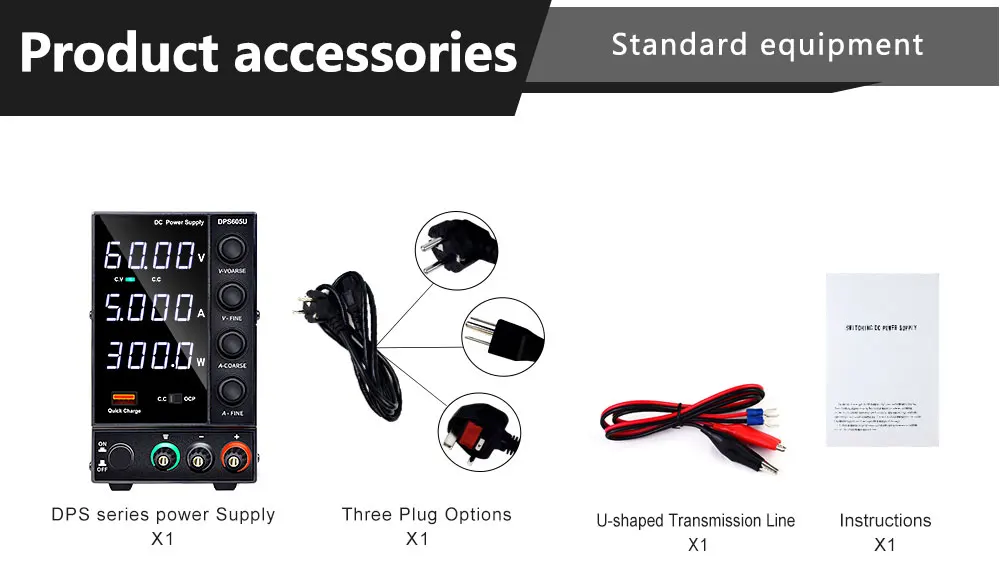 1 * Источник питания постоянного тока 1 * шнур питания (ЕС, США, Великобритания, Австралия) 3 * тестовая линия 1 * инструкции