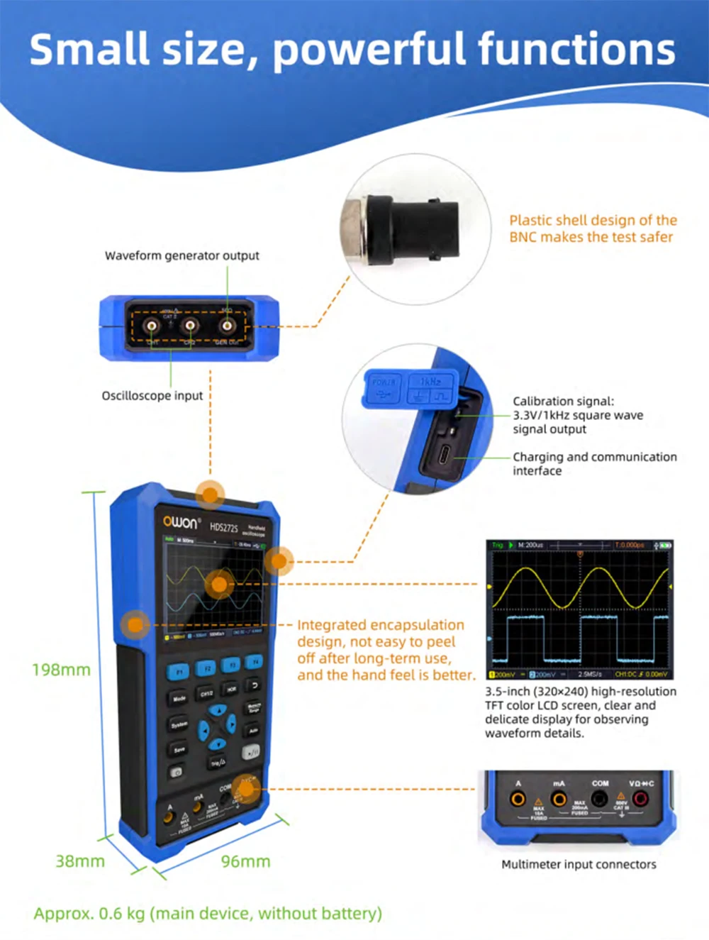 OWON HDS272 242 3-в-1 Портативный цифровой осциллограф генератор сигналов мультиметр 2CH Тип USB C 70 МГц 3,5 дюймов ЖК-дисплей Тесты метр