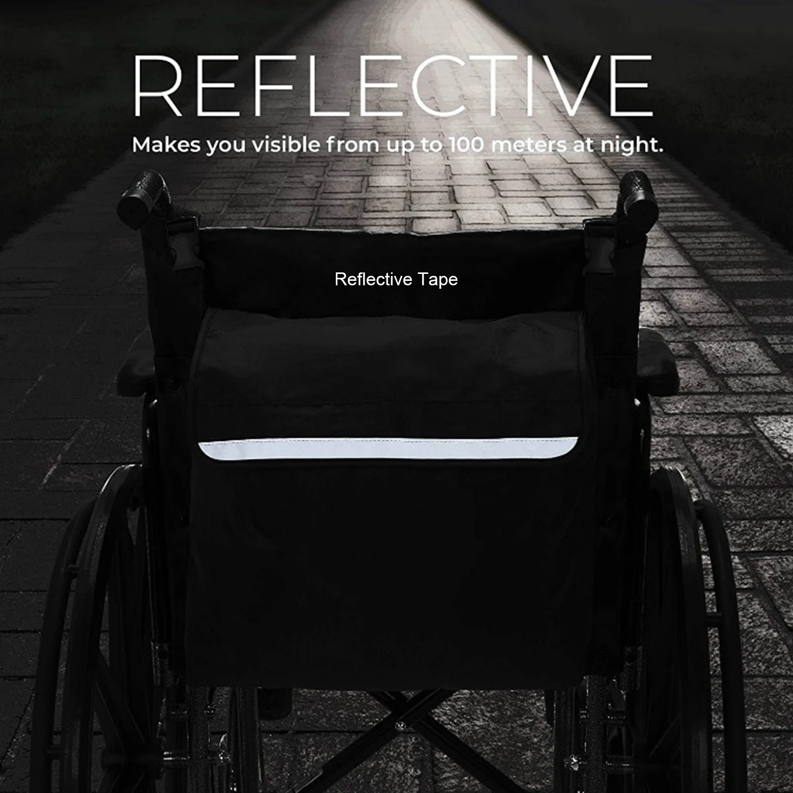 Прочная сумка для инвалидной коляски крепится с двумя легко регулируемыми лямками, что позволяет ей поместиться на всех стандартных инвалидных колясках, бариатрических колясках и транспортных стульях. Прочная сумка может держать кошелек, одежду или необходимые медицинские принадлежности.