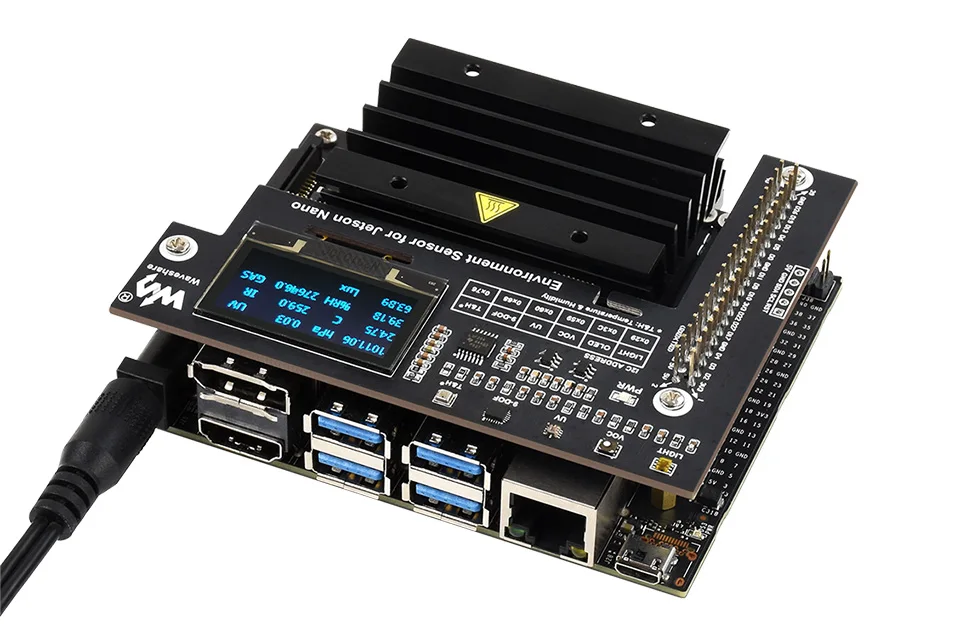 Этот модуль датчиков окружающей среды дает Jetson Nano Developer Kit возможность собирать данные о окружающей среде, такие как температура и влажность, давление воздуха, интенсивность окружающего светильник, VOC, IR ray, UV ray и т. Д. Он также может быть использован для создания робота, который может обнаруживать движение и ориентацию.