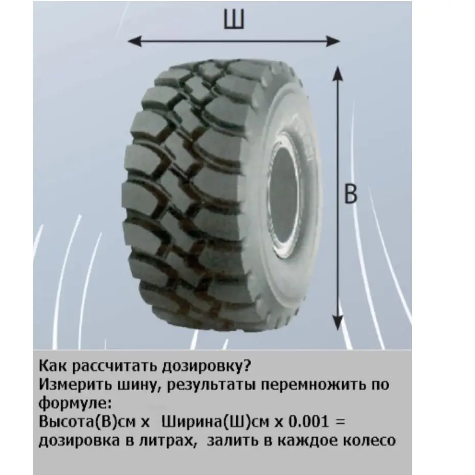 Как рассчитать дозировку? Измерить шину, результаты перемножить по формуле: Высота(H)см x Ширина(B)см x 0.001 = дозировка в литрах, залить в каждое колесо.