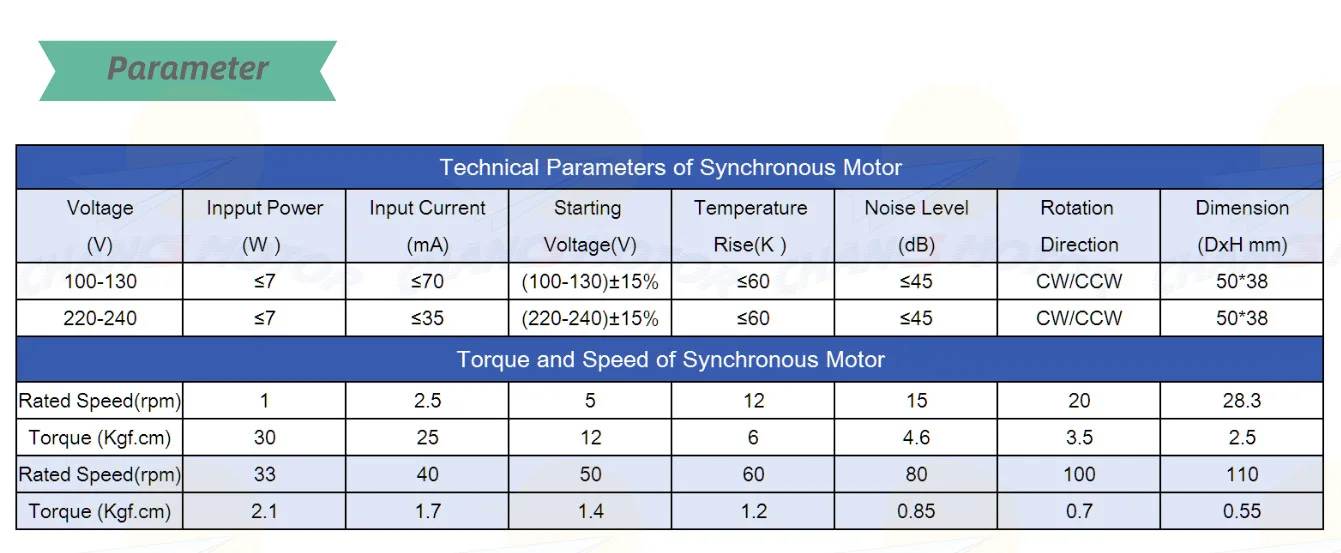 Диаметр вала: 7 мм; Вал Длина: 14,5 мм; Рабочее напряжение: 110 В переменного тока; Скорость: 2,5-3 об/мин; Частота: ~ 50/60 Гц; Мощность: 6 Вт; Конденсатор с алюминиевой крышкой: 0,56 мкФ; Tourque: ≤ 25 кг F. См; Вращение: CW/CCW (контролируемый);