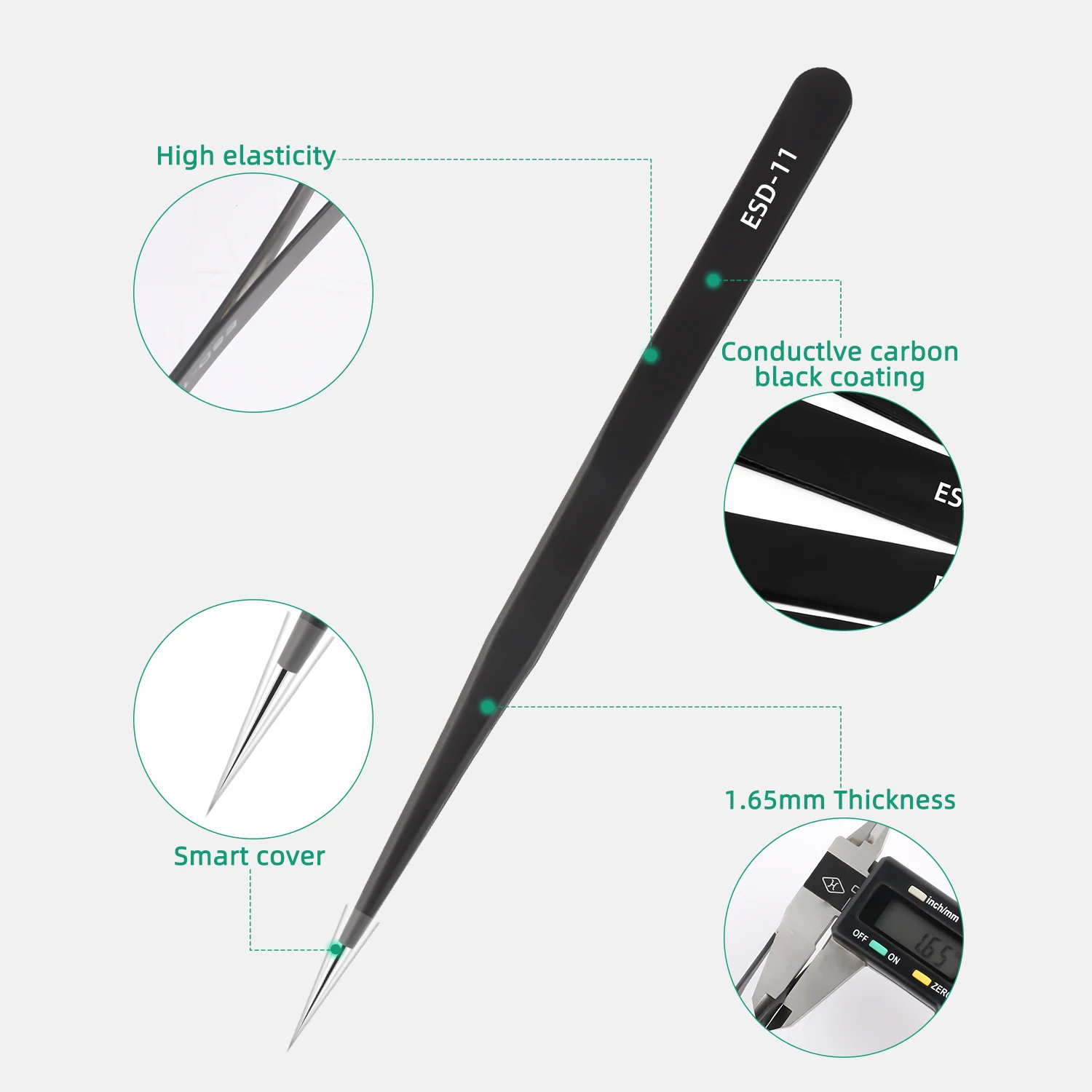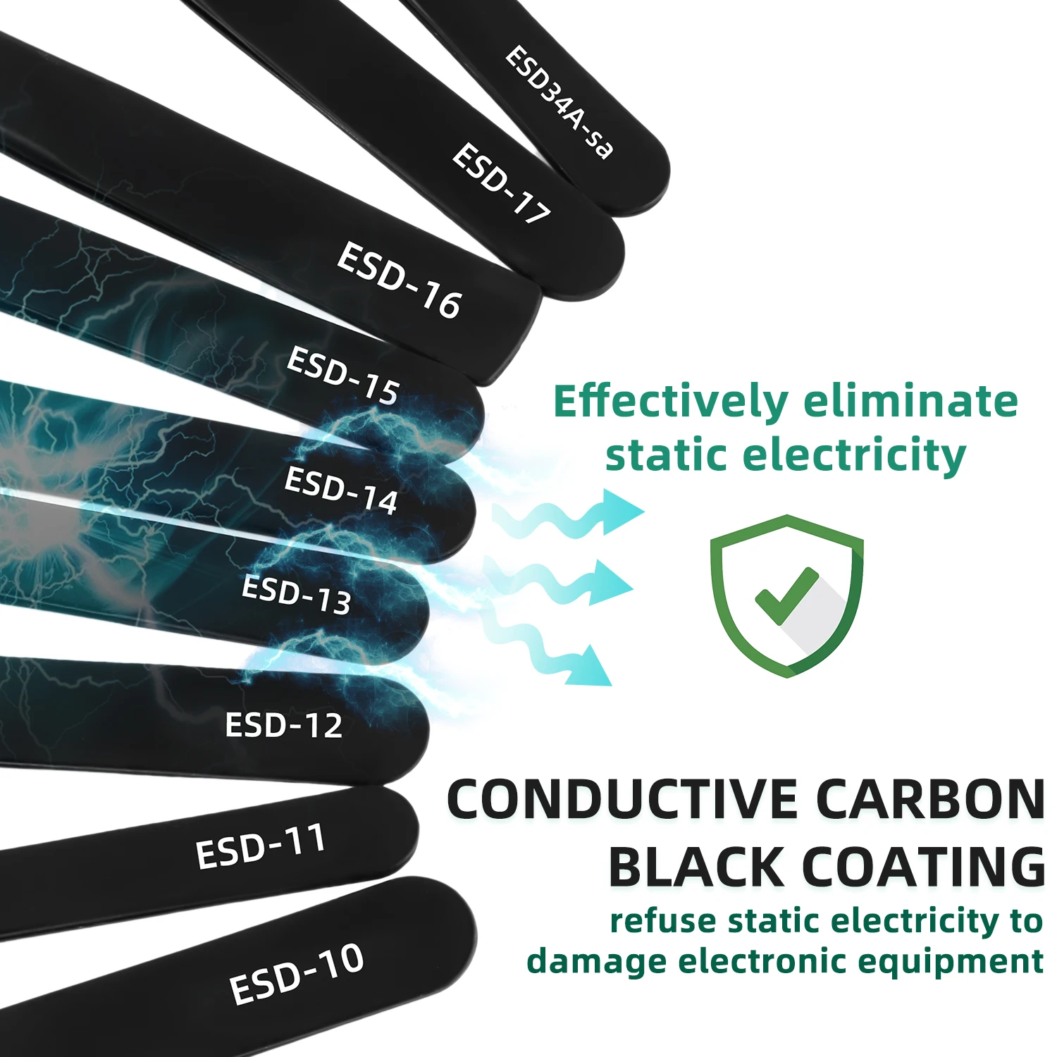 ● В комплект входит: 9 шт. высококачественных высокоточных пинцетов с антистатическим безопасным покрытием, немагнитные стальные пинцеты с тонким наконечником