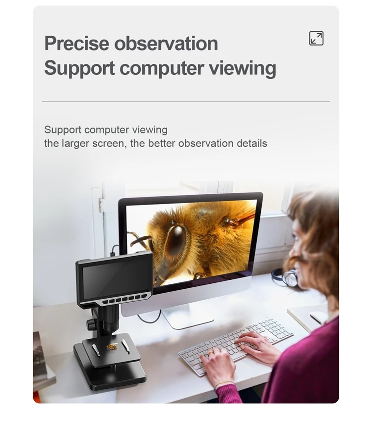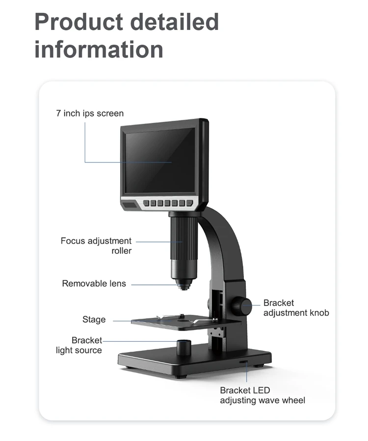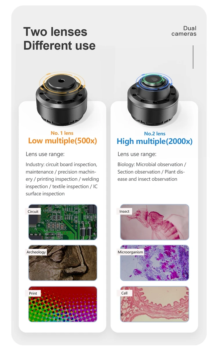 По обеим сторонам есть одиннадцсветодиодный Дов, которые могут заполнить светильник и сделать наблюдение более четким. Многоцелевой: ремонт телефонов, проверка печатных плат и пайка, миниатюрный ремонт часов, монтажная линия, декоративно-прикладное искусство и так далее. Выбирайте высококачественные материалы, корпус прочный, его нелегко сломать. Поддерживаемые системы: WindowsXP, Vista, Win7/8/10, Mac10.5 и выше. Языки: упрощенный китайский, традиционный китайский, японский, английский, корейский, французский, итальянский, немецкий, испанский, русский. Две линзы имеют свое собственное Применение: Маломощные линзы № 1 (500x), подходят для обслуживания и проверки печатных плат, проверки печати, идентификации нефрита и драгоценных камней и т. д. No.2 линзы высокой мощности (2000x), подходят для микробного наблюдения, наблюдения за секциями, наблюдения за вредителями растений, заболеваниями и т. д. Функция: двойной светодиодный источник светильник, можно снимать фото или видео, поддерживает хранение карт TF, аккумулятор большой емкости, Двойной источник питания, адаптируется к большому количеству сценариев. Поддержка просмотра экрана компьютера, более четкое наблюдение, яркая краска на металлической поверхности, ощущение тонкой руки, нескользящая подставка для ног внизу, наблюдение более стабильное.