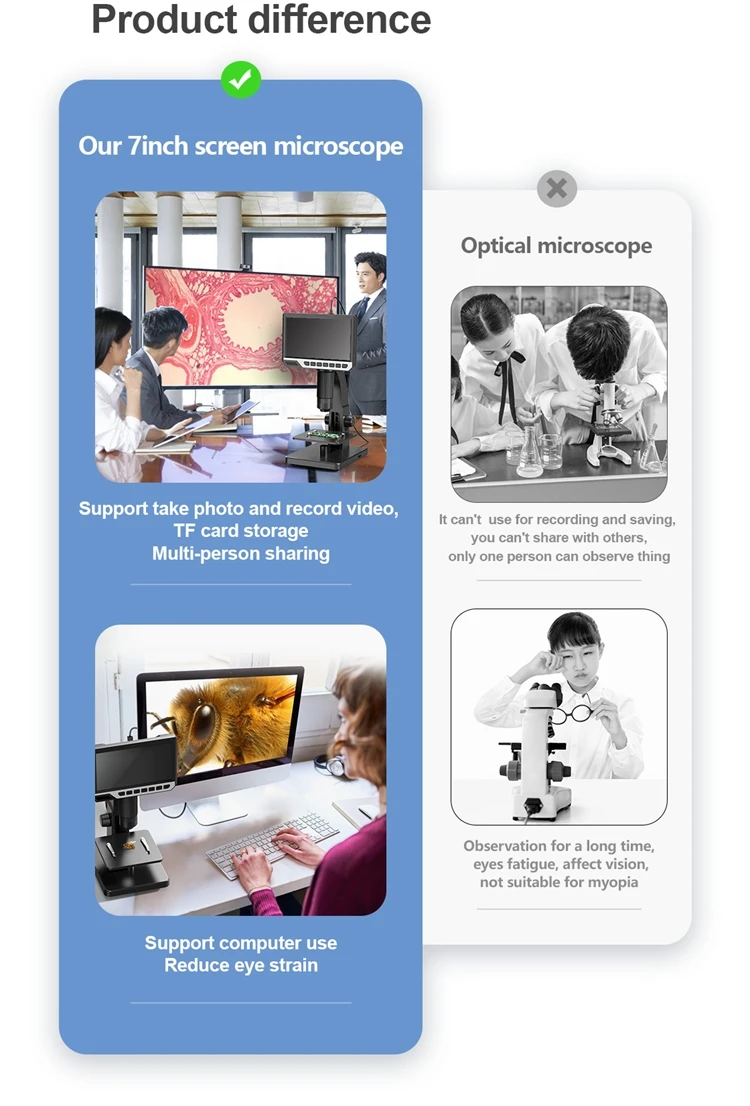 Микроскоп Inskam315-это обновление до традиционного микроскопа. Оснащенные 11 светодиодный одами, есть две линзы с разным увеличением, не только для ежедневного наблюдения, но и для наблюдения за микроорганизмами. Он поддерживает несколько языков и нескольких систем и имеет более широкий спектр приложений.