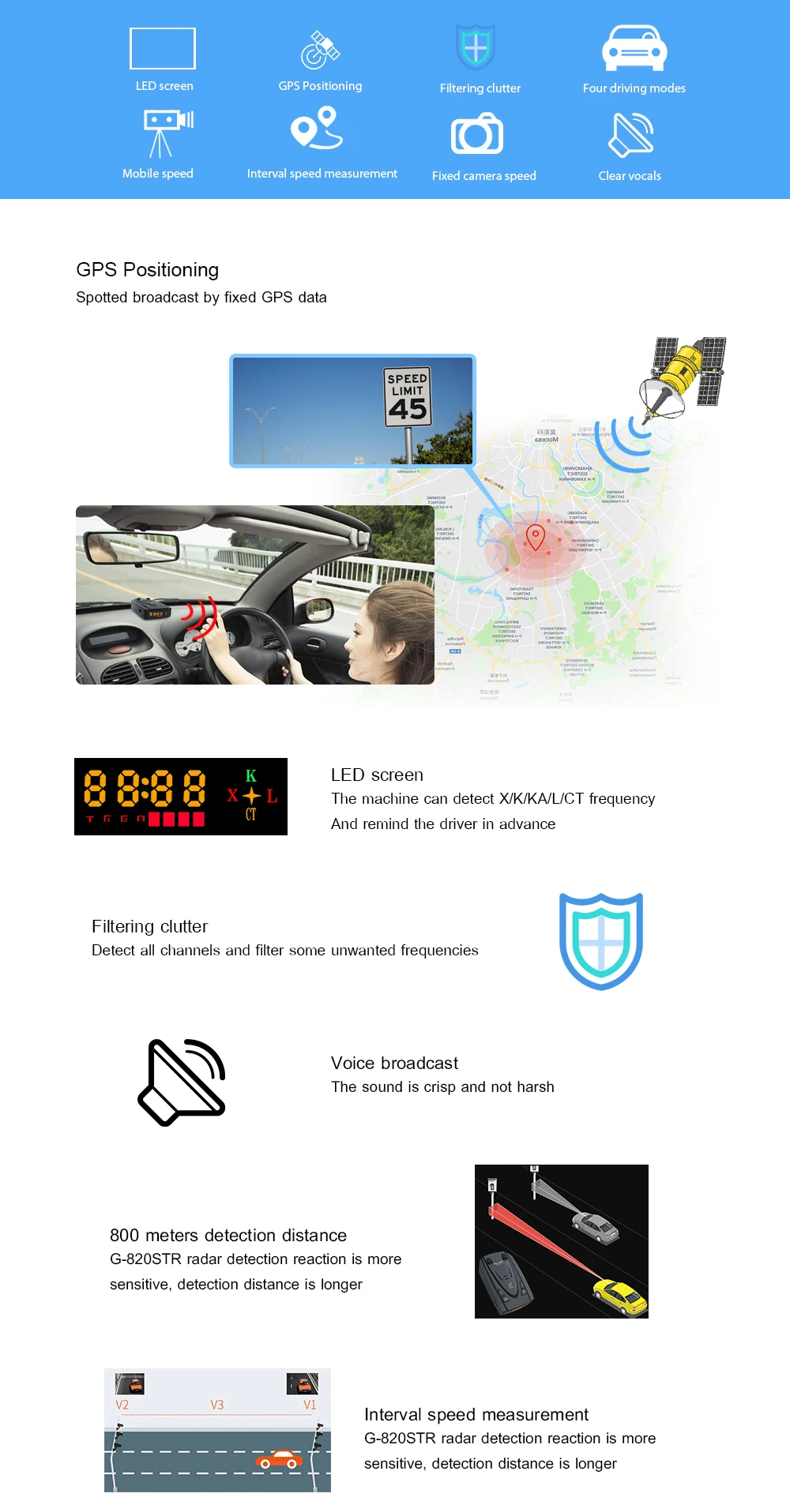 A:На расстояние сигнализации антирадарного оборудования влияет скорость транспортного средства. Чем выше скорость, тем выше расстояние сигнализации и чем ниже скорость, тем короче расстояние сигнализации. Максимальное расстояние сигнализации составляет 800 м. Как правило, это нормально, что расстояние сигнализации составляет 800 м. Если вы не согласны, пожалуйста, не заказывайте.