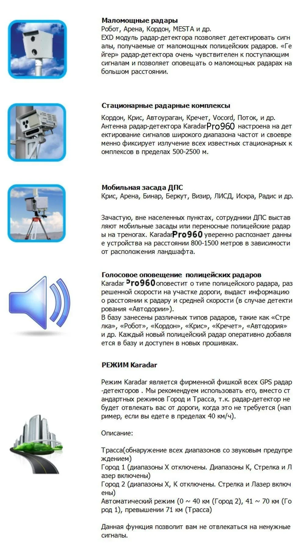 Karadar Pro960 сообщит о типе полицейских радаров, допустимой скорости на дорожном участке, даст информацию о расстоянии до