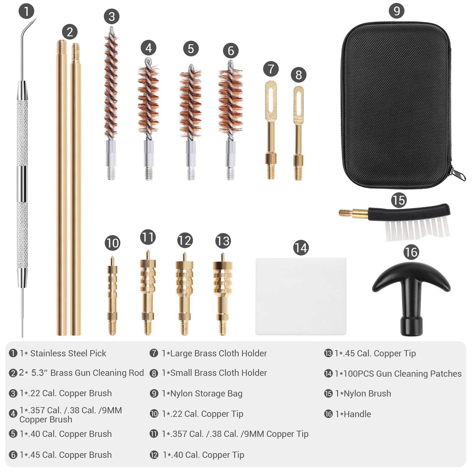 2,16 шт. инструменты-посылка включает в себя: 1 * нейлоновая сумка для хранения (1 шт.) • ручки; 10,5 "латунь оружейная Чистящая стержень (2 слоев) (1 шт.) • большой латунный держатель ткани; 1 * маленький латунный тканевый держатель; 1 * нейлоновая щетка;.22 калибра медная щетка и медный наконечник; .45 кал. Медная щетка и медный наконечник; .40 кал. Медная щетка и медный наконечник;.357 Cal./.38 Cal./9 мм медная щетка и медный наконечник; 1 * выбор из нержавеющей стали; 100 * Патчи для чистки пистолета.