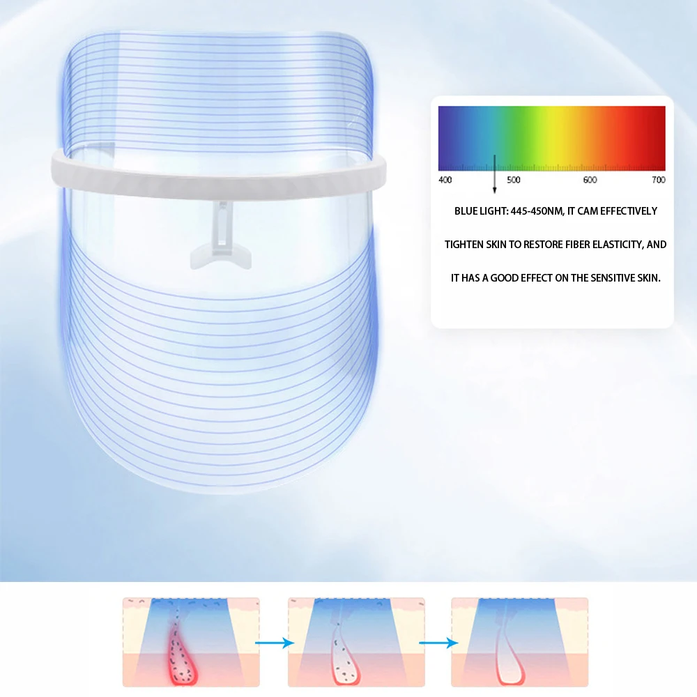 Синий светильник: 445-450нм, он эффективно затягивает кожу, чтобы восстановить эластичность волокна, и он хорошо влияет на чувствительную кожу.