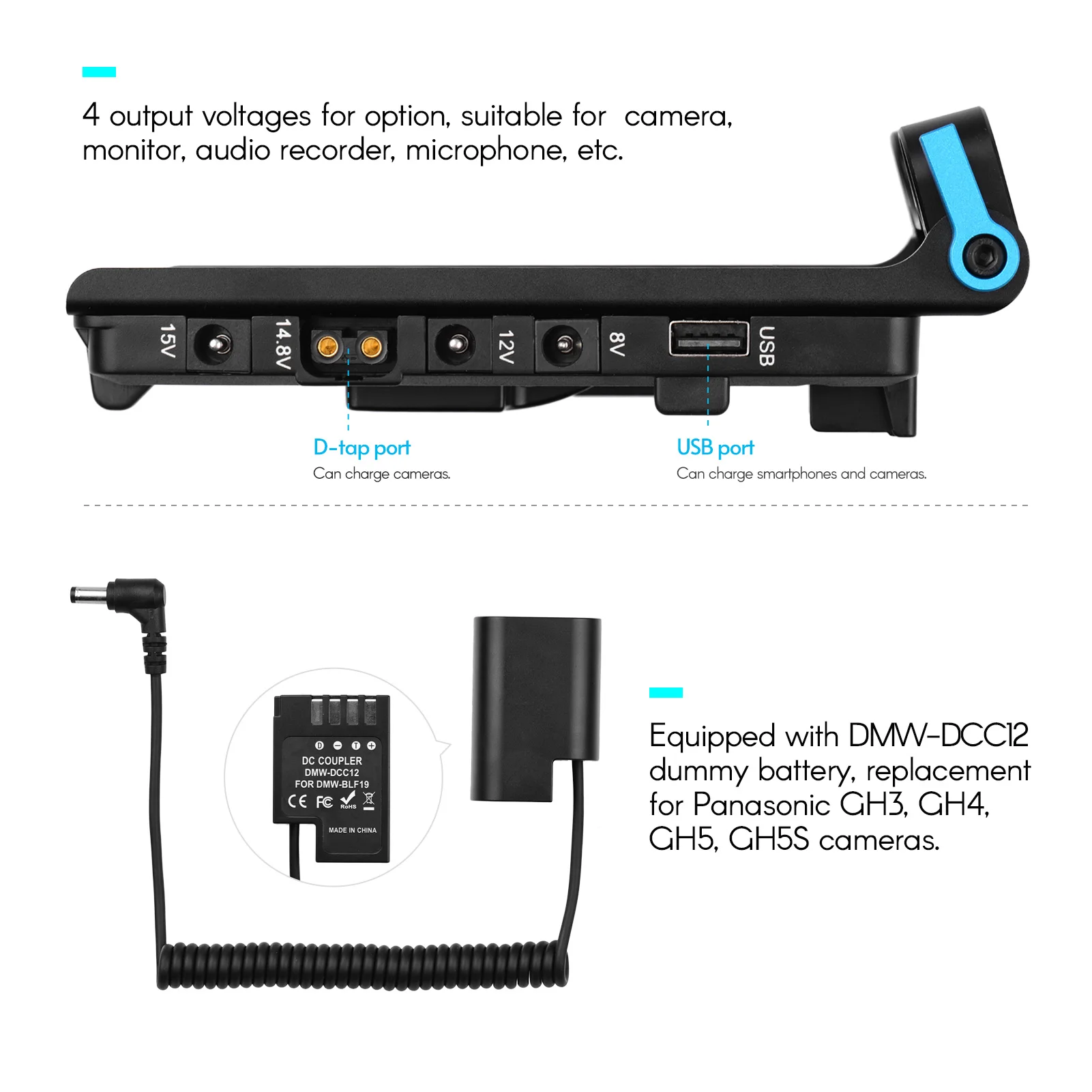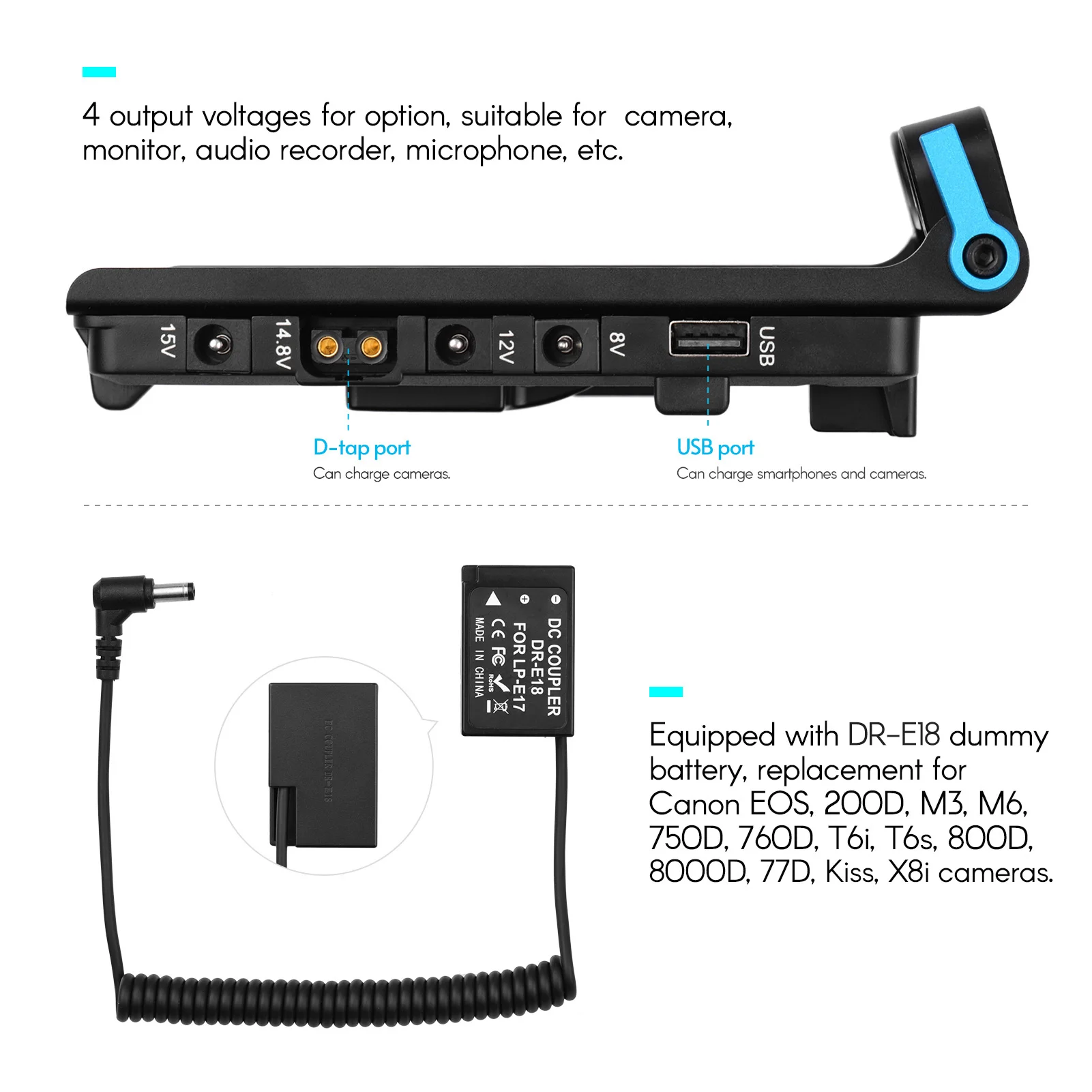 4 output voltages for option: DC 8V for DSLR, DC 12V for monitor, DC 14.8V and DC 15V for camcorder.