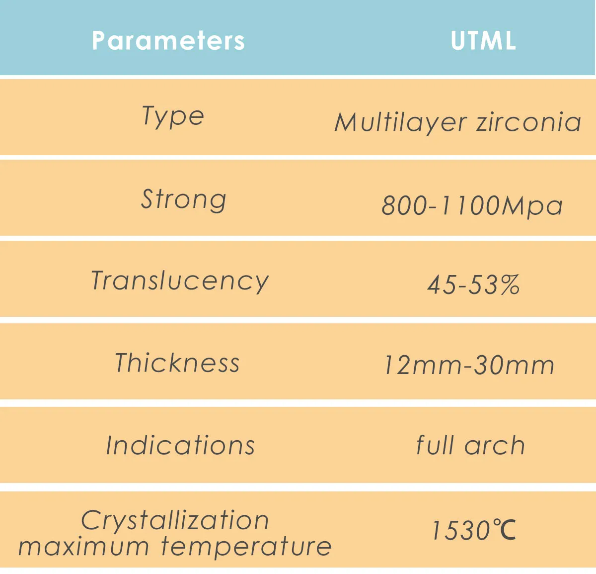 Полихроматический, сверхвысокий полупрозрачный Цирконий с интегрированным затененным и полупрозрачным градиентом. Плавные переходы теней имитируют зубную эмаль, зубные и шейные оттенки в естественном свободном развитии без разрушительных краев теней. Зуб, как презатенение, позволяет эффективно обрабатывать без процедуры окрашивания. Из-за более чем 1100 МПа прочность на изгиб в базовой линии диска. Практически все типы показаний могут быть реализованы, новые особенности и все клинически доказанные преимущества UTML объединены в одном материале