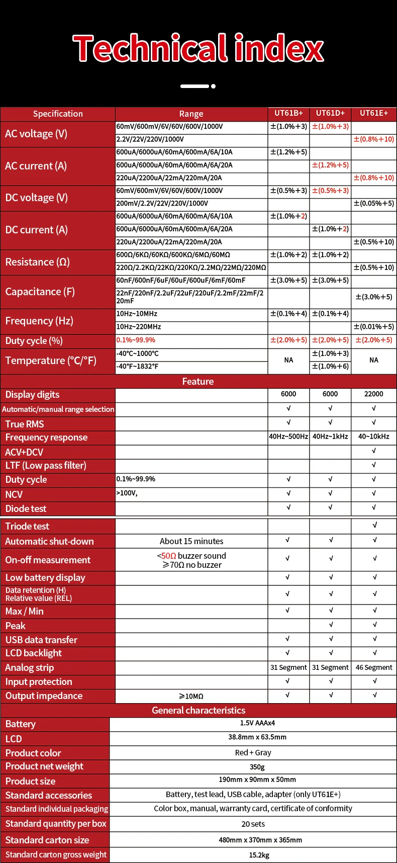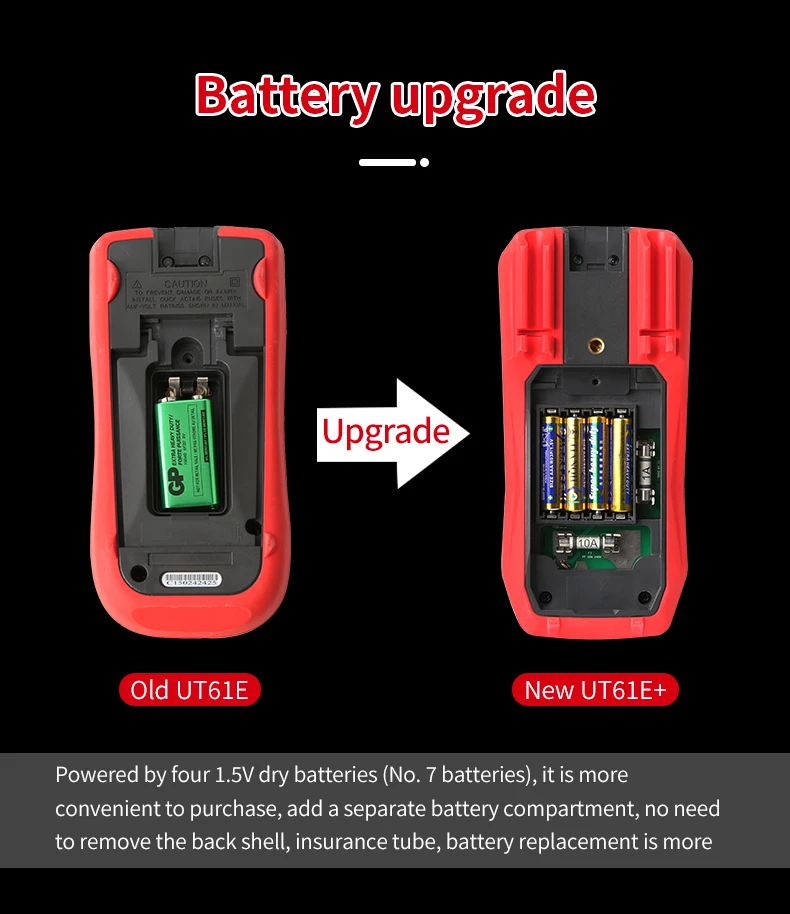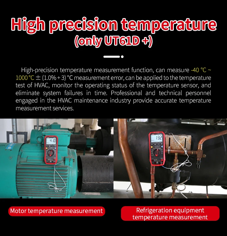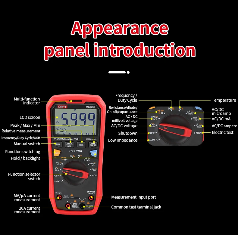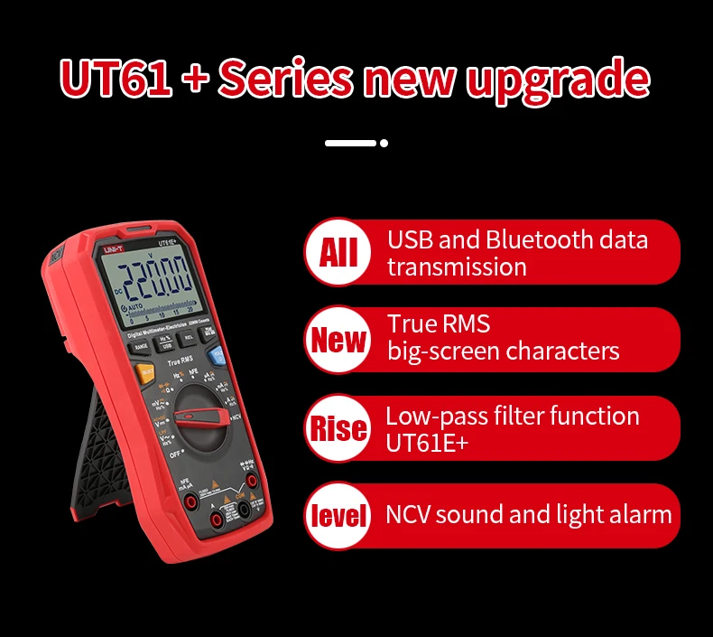 ------- Подсветка -------Серия UT61 +-это надежные цифровые мультиметры RMS с отображением 6000 (UT61B +/D +) и 22000 (UT61E +). Он может измерять до 1000 В переменного/постоянного тока.