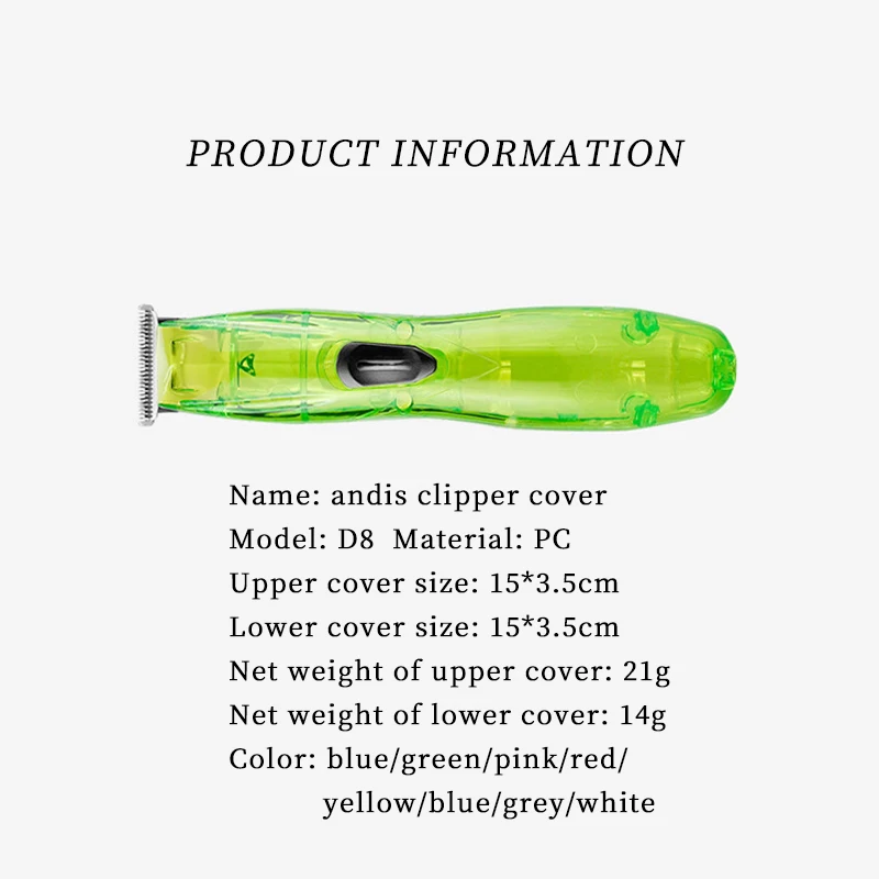 Название: чехол для клипера andis Модель: D8 Верхняя крышка Размер: 15*3,5 см Нижняя крышка Размер: 15*3,5 см Вес нетто верхней крышки: 21 г Вес нетто нижней крышки: 14 г Цвет: синий/зеленый/розовый/красный/желтый/синий/серый/белый Материал: Поликарбонат