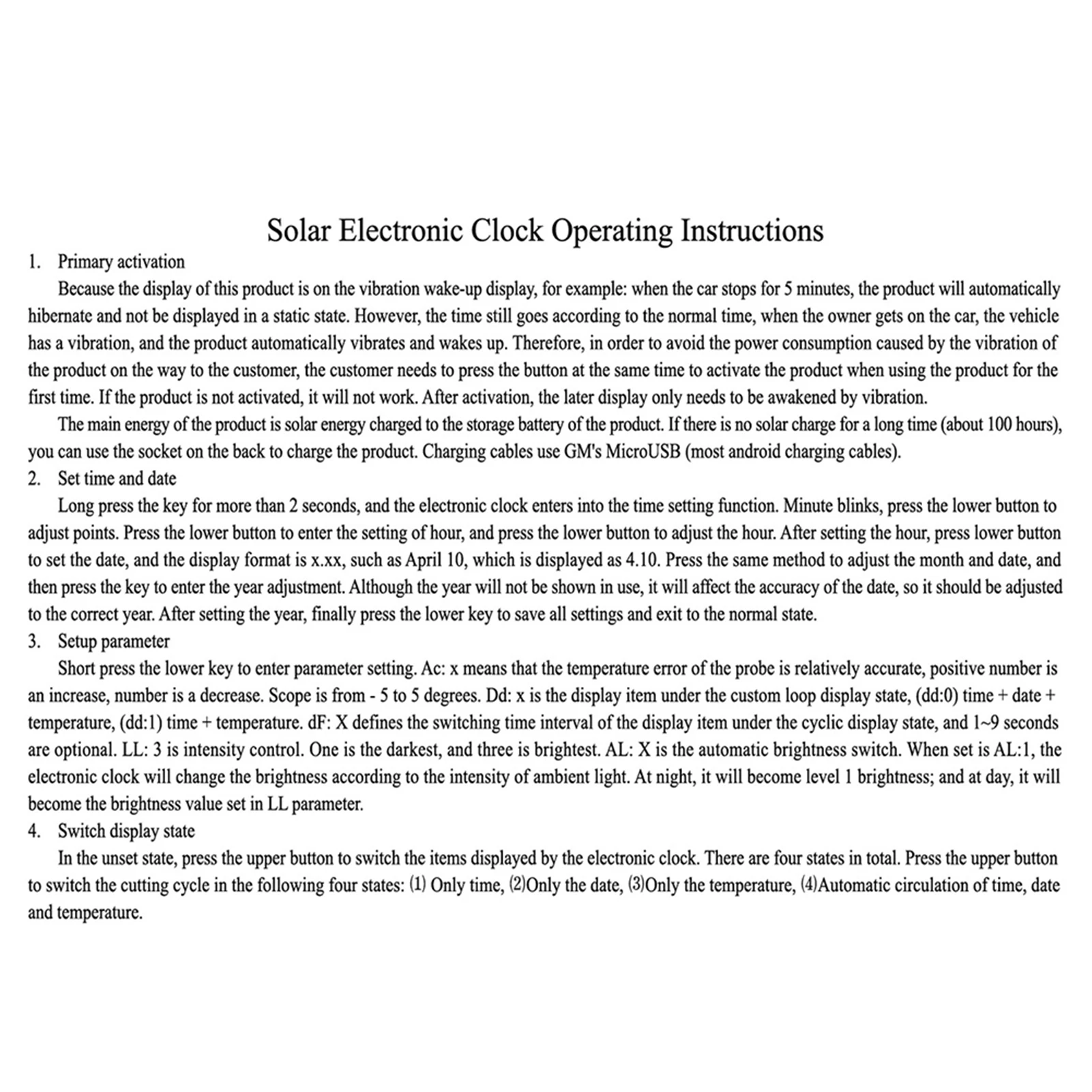 С функцией контроля заряда батареи, когда мощность батареи низкая, напоминание о низком заряде батареи «-Lo-» будет появляться один раз в минуту, пока он не будет закрыт, чтобы избежать Слива заряда батареи и воздействия на срок службы батареи. После его выключения, зарядите часы, разоблачив его на солнце или с помощью кабеля micro USB, чтобы зарядить его, нажмите кнопку снова, чтобы начать его.