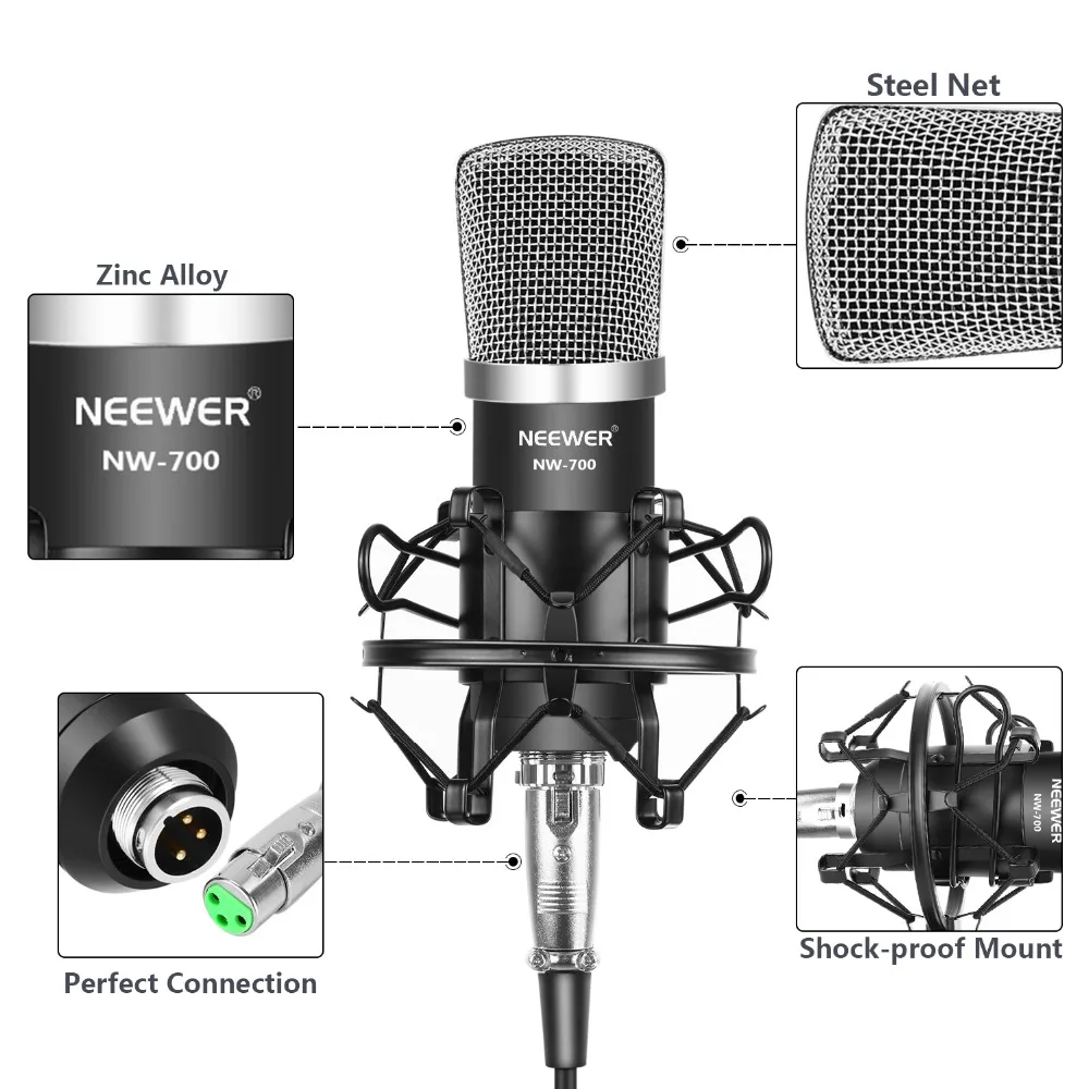Профессиональный Студийный конденсаторный микрофон Neewer NW-700 для трансляции и записи, в комплект входит: (1) конденсаторный микрофон NW-700 + (1) металлическое амортизирующее крепление для микрофона + (1) шариковый противоветровой Поролоновый колпачок + (1) микрофонный аудиокабель (черный)