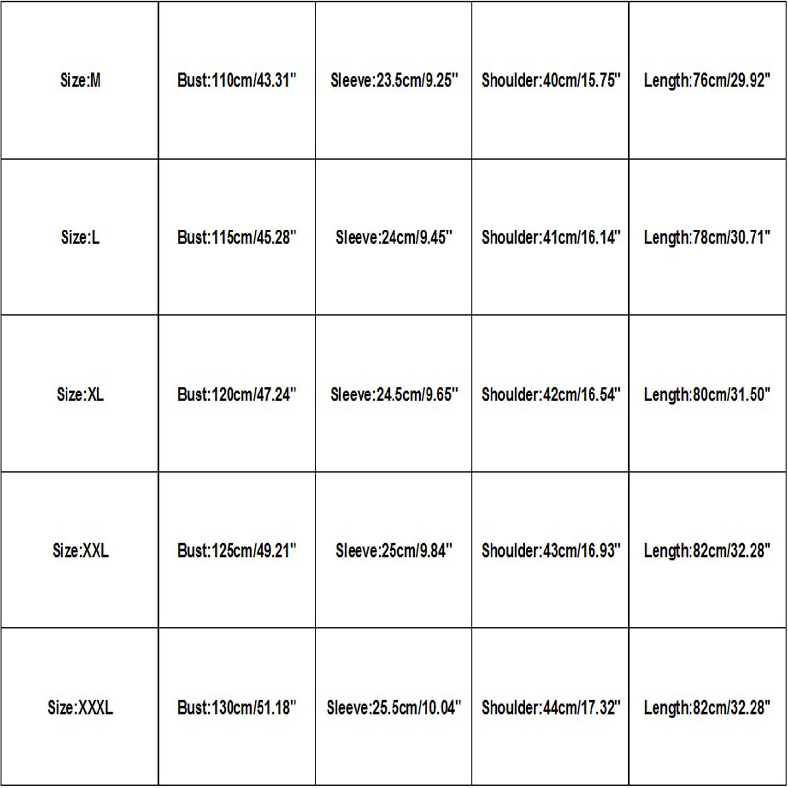 Размеры США Великобритания ЕС Бюст Рукав Плечо Длина М 6 10 36 110 см/43,31 дюйма 23,5 см/9,25 дюйма 40 см/15,75 дюйма 76 см/29,92 дюйма L 8 12 38 115 см/45,28 дюйма 24 см/9,45 дюйма 41 см/16,14 дюйма 78 см/30,71 дюйма XL 10 14 40 120 см/47,24 дюйма 24,5 см/9,65 дюйма 42 см/16,54 дюйма 80 см/31,50 дюйма XXL 10 14 40 125 см/49,21 дюйма 25 см/9,84 дюйма 43 см/16,93 дюйма 82 см/32,28 дюйма XХХL 12 16 дюймов 42 130 см/51,18 дюйма 25,5 см/10,04 дюйма 44 см/17,32 дюйма 82 см/32,28 дюйма
