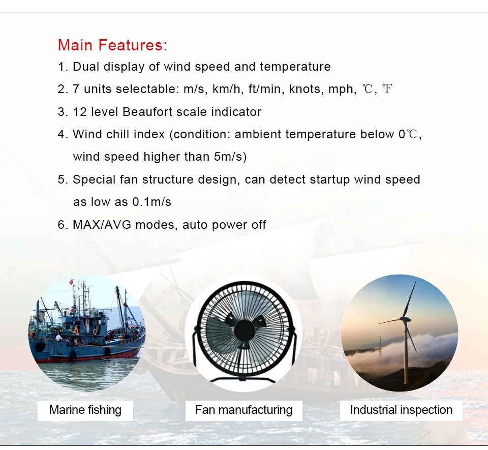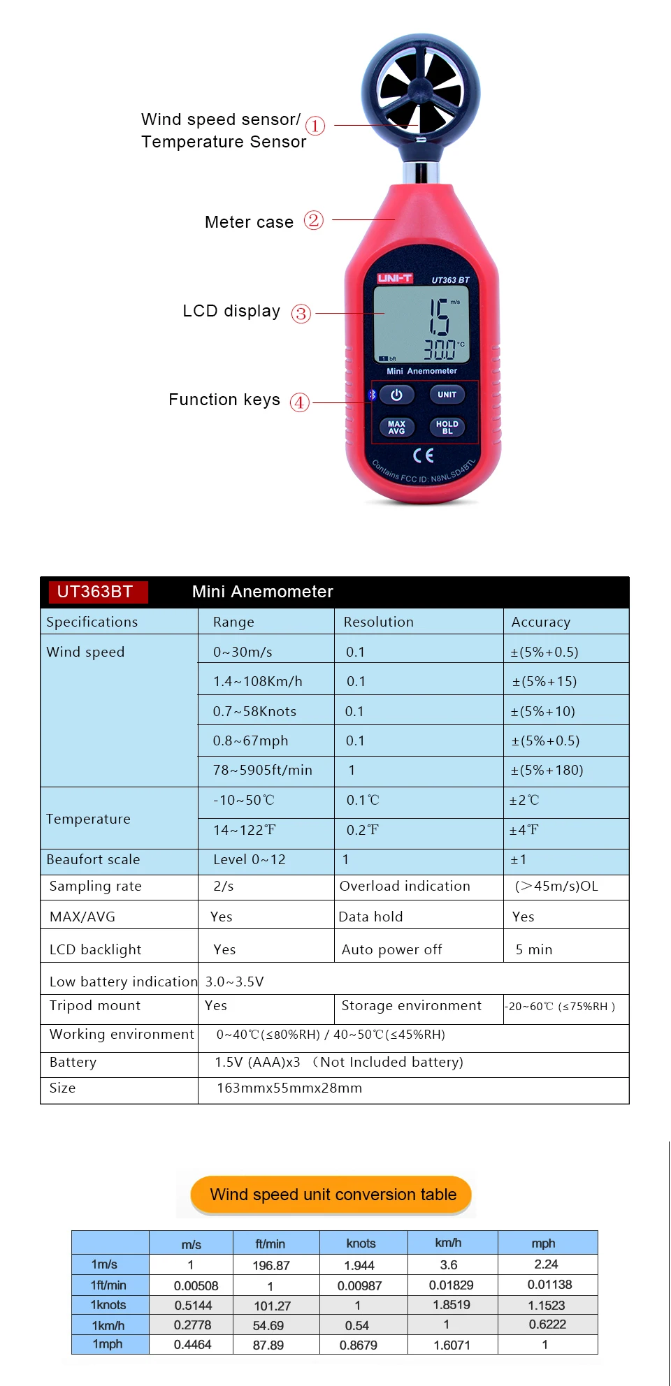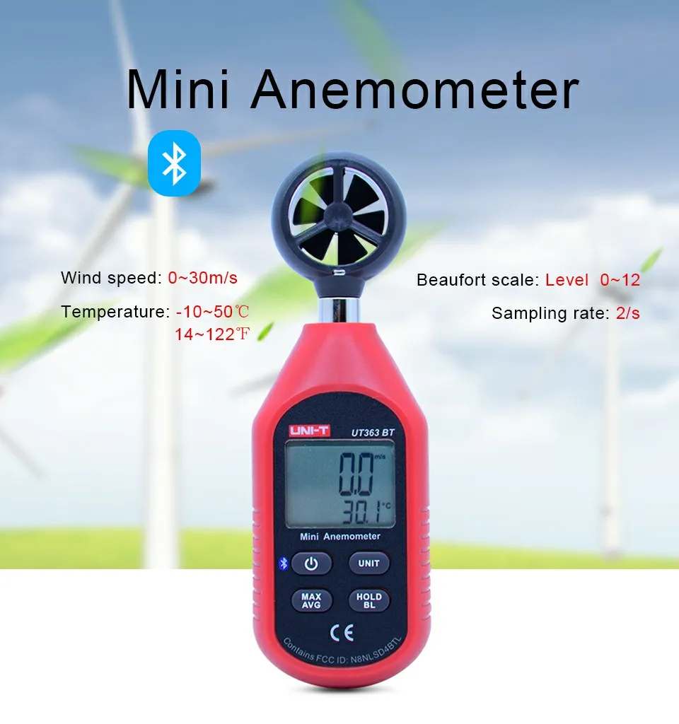 Мини-анемометр UT363BTUT363BT-это мини-измеритель скорости ветра и температуры, который может измерять скорость ветра до 45 м/с. Он использует Bluetooth для передачи данных и анализа, хранения, экспорта через мобильное приложение UNI-T (iENV). iENV может быть загружен с Google Play, Apple store или UNI-T на веб-сайте путем поиска «я».