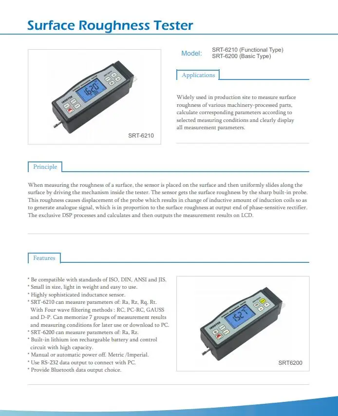 При измерении шероховатости поверхности датчик помещается на поверхность, а затем равномерно скользит по поверхности, управляя механизмом внутри тестера. Датчик получает шероховатость поверхности острым встроенным зондом. Эта шероховатость вызывает смещение зонда, что приводит к изменению индуктивного количества индукционных катушек, чтобы генерировать аналоговый сигнал, пропорционально шероховатости поверхности на выходе из фазочувствительного выпрямителя. Эксклюзивный DSP обрабатывает и рассчитывает, а затем выводит результаты измерений на ЖК-дисплее.