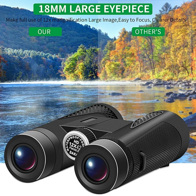 12x42 бинокль для взрослых и детей, компактный охотничий бинокль с четким низким освещением, 18 мм большой окуляр бинокль для наблюдения за птицами, спорта на открытом воздухе и использование BAK4 FMC 16,5 мм супер яркий BAK4 Призма FMC объектив водонепроницаемый