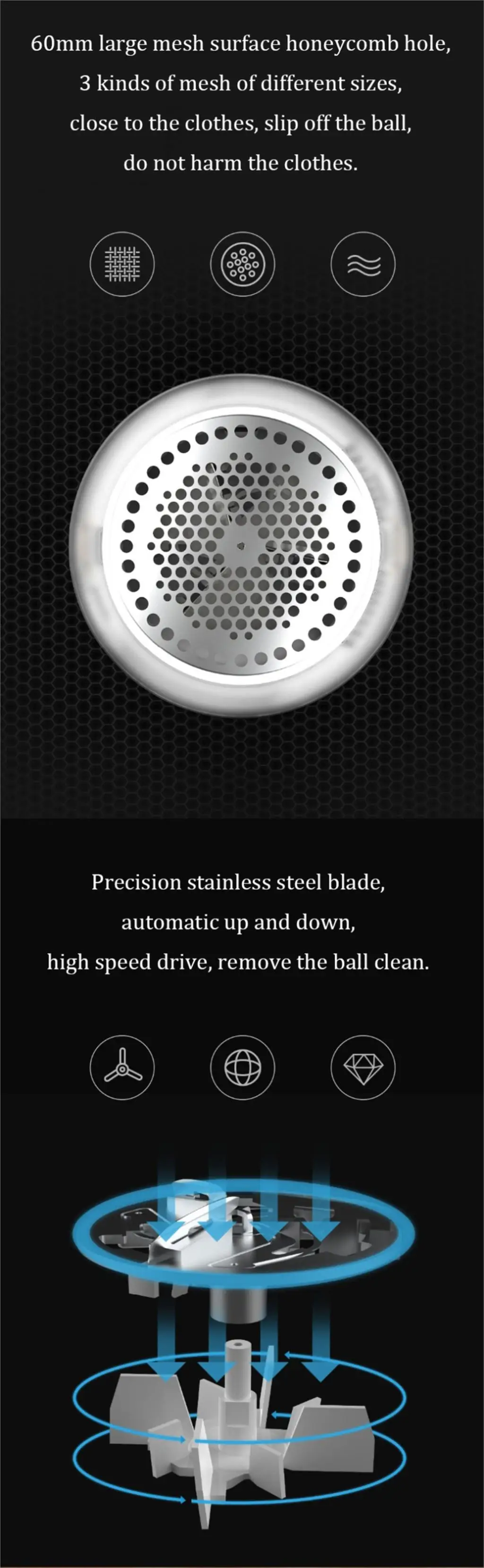 Хороший помощник для проблем с катышками одежды, подходит для свитера, шерстяного пальто, свитера, шарфа и т. д. Отрицательное давление центробежные 8 лопастей вентилятора, скорость двигателя до 7000р/мин, быстрое и чистое удаление шариков. 60 мм большая сетчатая поверхность с сотовым отверстием, 3 вида сетки разных размеров, близко к одежде, соскальзывают с мяча, не вредят одежде. Точное лезвие из нержавеющей стали, автоматическое вверх и вниз, высокоскоростной привод, очистите мяч. Одна клавиша, световой светильник, простая работа. Светильник, небольшой размер, легко носить с собой, путешествовать, бизнес, дома и других сцен.