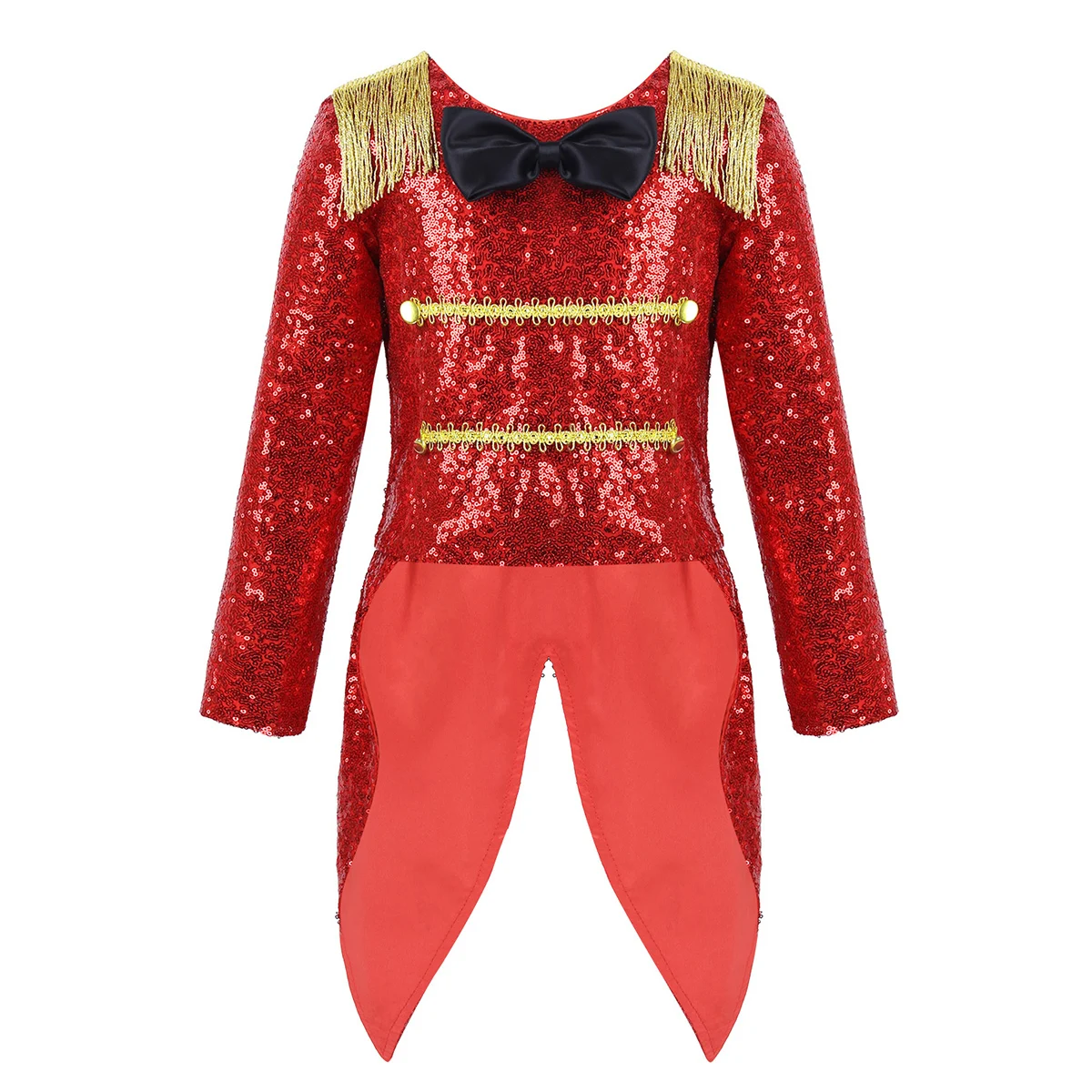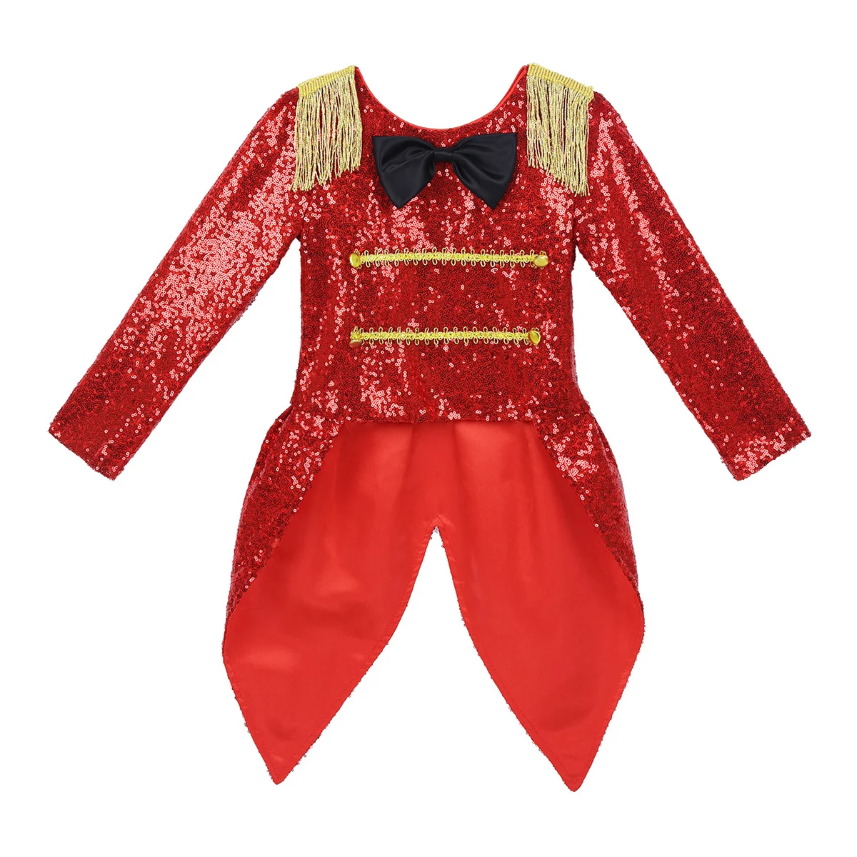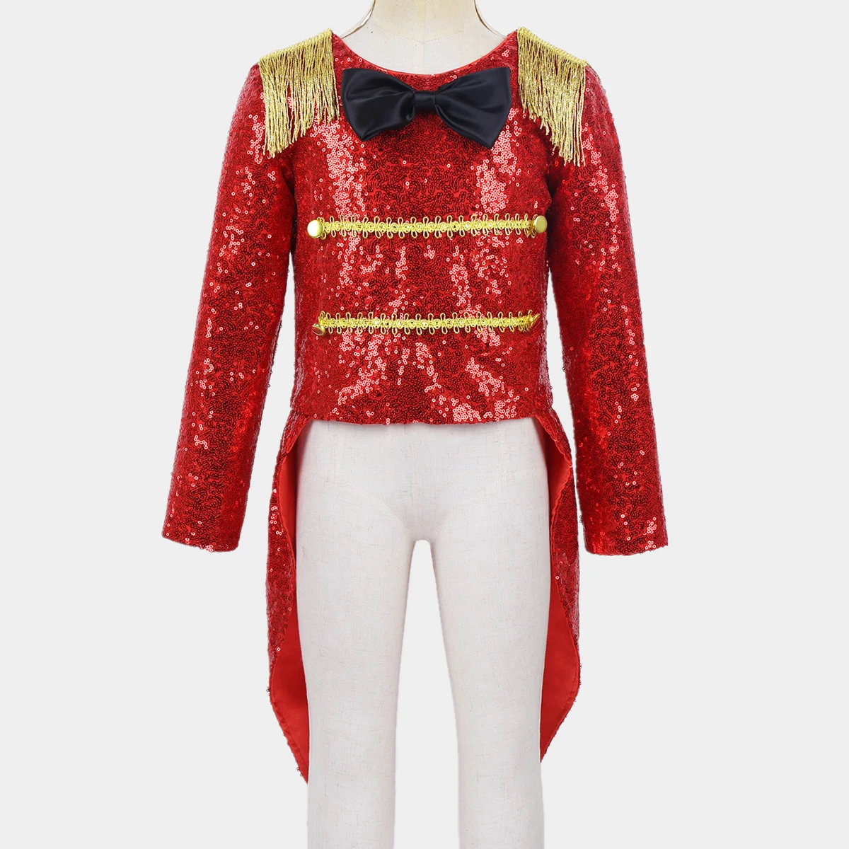 Пальто изготовлено из полиэстера и сатина, ручная стирка. Таблица размеров означает возраст для девочек, но только для общего руководства. Длинные рукава, плечи украшены бахромой, круглый вырез, черный галстук-бабочка. Спереди украшены золотыми плетеными элементами и пуговицами. Скрытая молния сзади. Блестящее пальто с пайетками и атласной подкладкой для удобного ношения. Задняя часть с хвостом ласточки. Волшебное цирковое пальто ringmaster для вашей девочки. Подходит для Хэллоуина, косплея, вечерние темы, ролевых игр, нарядов, фотографий, праздников и т. д.Полезные советы: Замеры делаются вручную, поэтому учитывайте небольшие погрешности. Цвет на фото может немного отличаться от реального товара из-за особенностей цветопередачи различных мониторов.