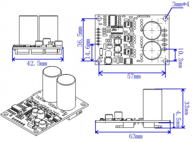 2. Этот драйвер платы используется в течение 3-фазовый бесщеточный Бессенсорный двигатель, но не подходит для всех размером 3-фазовый бесщеточный Бессенсорное моторы напрямую. Если Эффект вождения не очень хороший (например, запуск дрожания, Реверсивный, рабочий ток двигателя noload слишком большой, скорость не стабильна, эффективность низкая, И не может начать работу с нагрузкой.) Клиенты могут настроить сопротивление и емкость платы водителя в соответствии с реальной ситуацией для достижения лучшего эффекта вождения (см. Приложение для того, как сделать регулировку)3. JYQD-V6.5E плата без корпуса и радиатора. Если мощность двигателя ниже 100 Вт, нет необходимости добавлять радиатор, это необходимо только для обеспечения нормальной вентиляции и хорошей изоляции. Если мощность двигателя превышает 100 Вт, он должен добавить радиатор, как показано на диаграмме ниже.