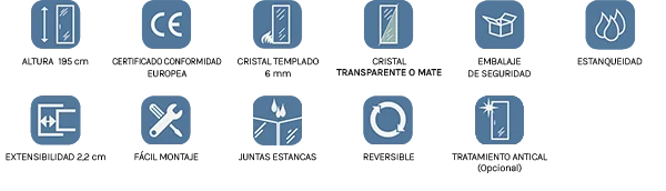 Передний душевой экран, состоящий из фиксированной раздвижной двери, стекла 6 мм, профилирования по всей своей конструкции и высоты 195 см. Полированный анонизированный алюминиевый профиль с серебристой глянцевой отделкой. Прозрачное стекло.
