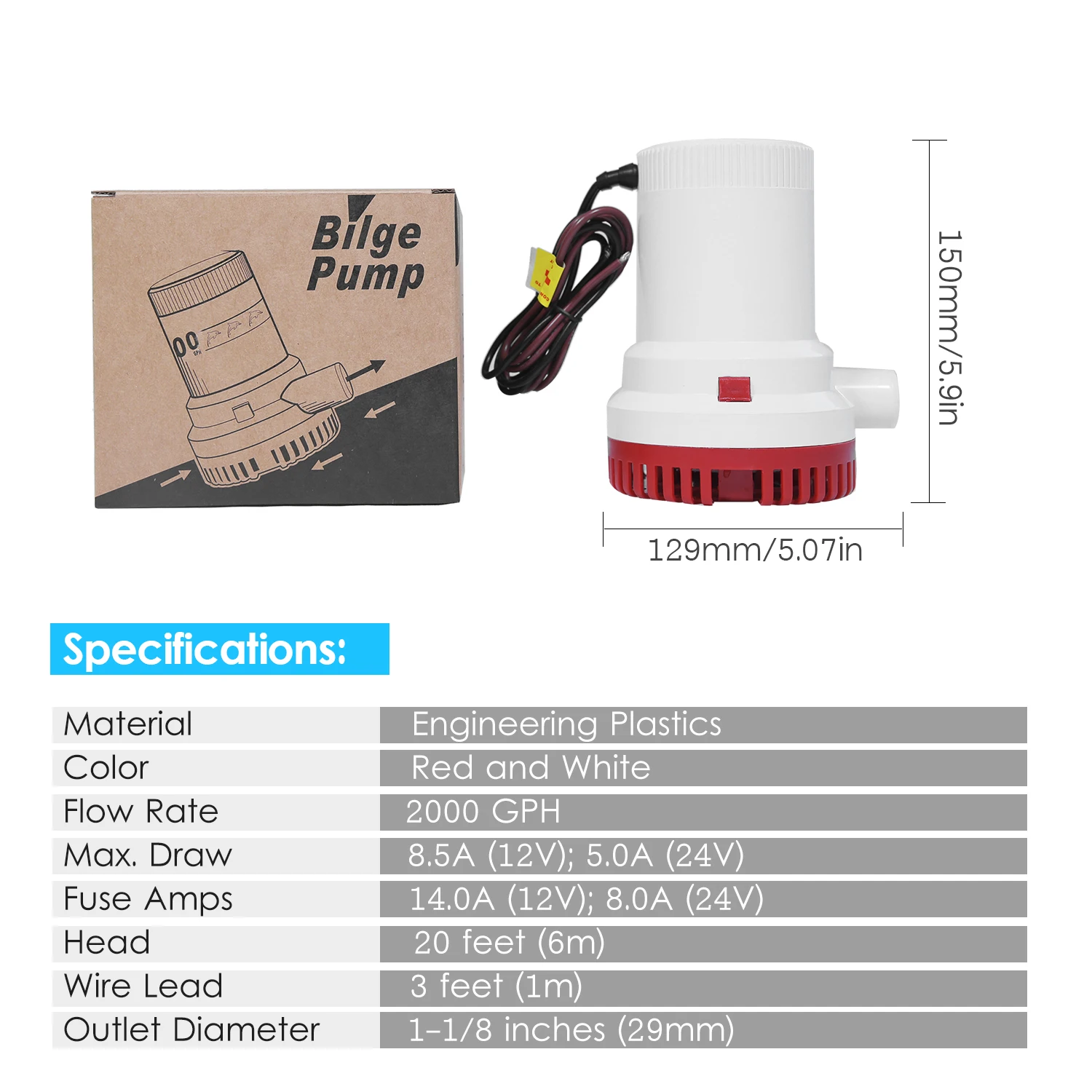 The high capacity bilge pump uses a float switch and a panel switch to detect water flow and then auto turn it on. It serves to evacuate accumulated water and oil from your boat at flow rate of 2000 gallons per hour, and with 1-1/8 inches hose outlet for easy installation, removable strainer for convenient cleaning.