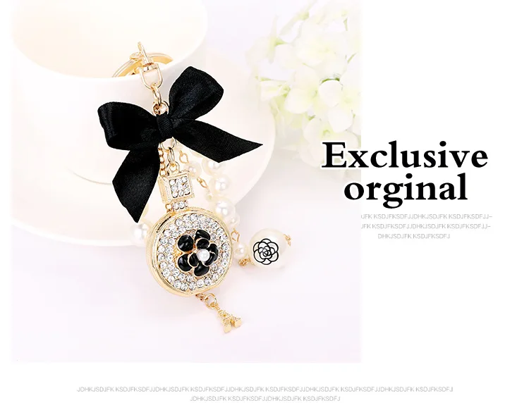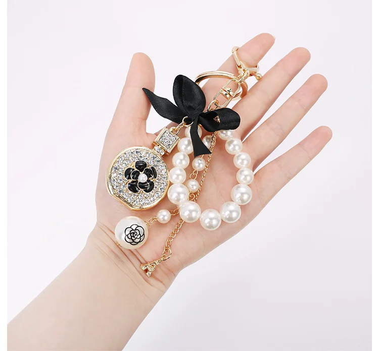 Имитация жемчужные духи, Хрустальная бутылка, железная башня на цепочке, брелок, автомобильный брелок, сумка, очаровательные аксессуары, бант, женский брелок для девочек, подарок