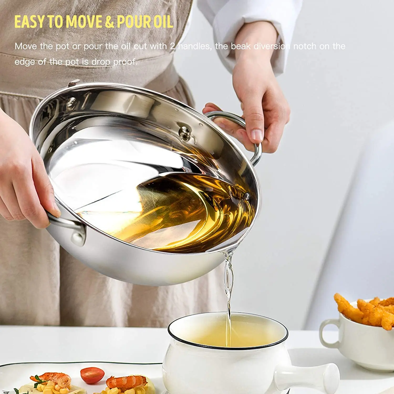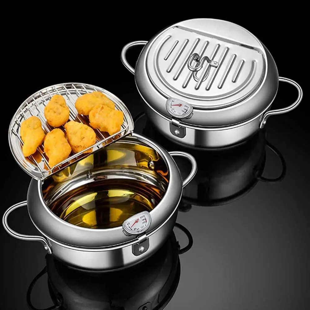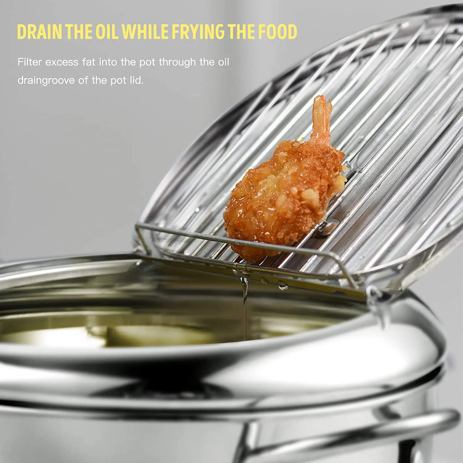 С независимым термометром-точный контроль температуры масла делает еду более вкусной, эта фритюрница tempura поставляется с термометром, поэтому вы можете постоянно проверять температуру во время приготовления пищи. Прилагаемый термометр может измерить до 200 ℃ и сообщить вам соответствующую температуру для жарки. Он широко используется для индукционной плиты, газовой плиты и т. д.