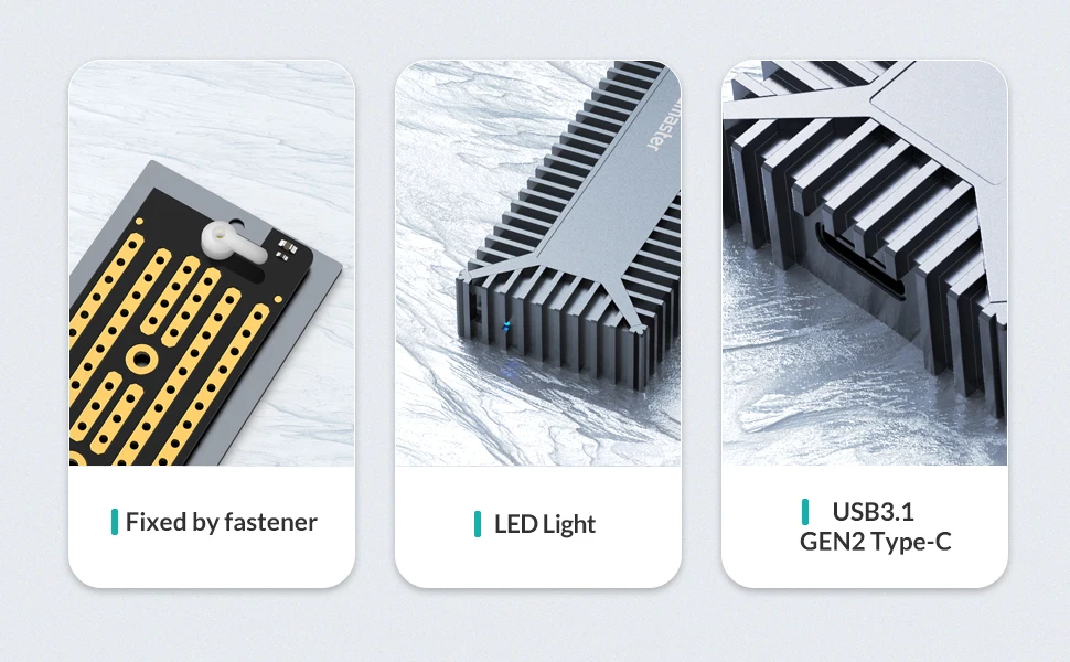 Алюминиевый корпус закрыт одним винтом. Упрощая утомительную установку, обеспечивая стабильность общей структуры. Другой включенный винт используется для фиксации SSD, максимально снижая износ интерфейса SSD.