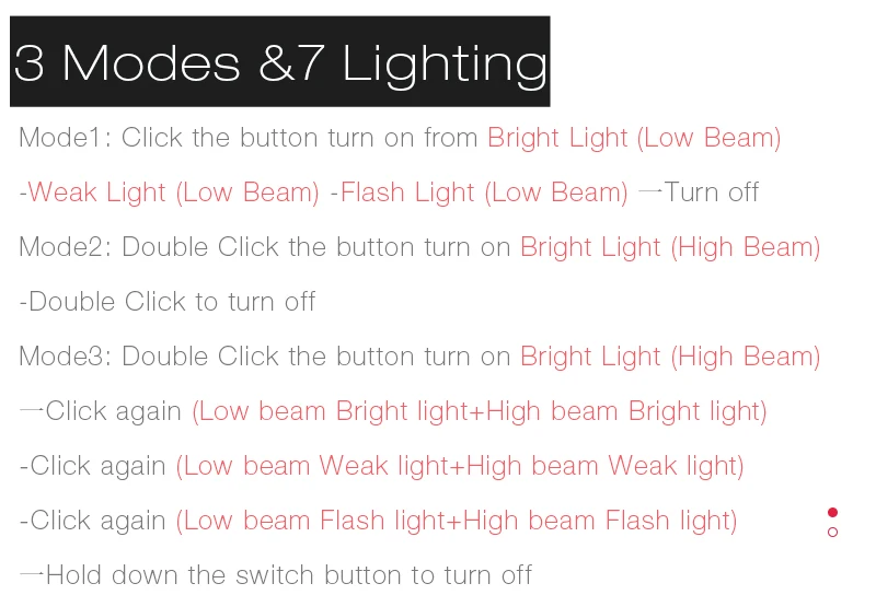 ** 3 режима и 7 освещения, переключатель ближнего/дальнего света по желанию для удовлетворения различных условий