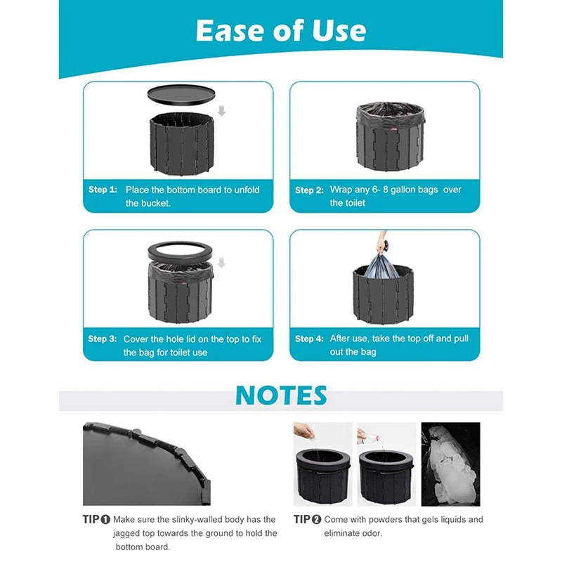 [Usage method]: 1. Place the bottom plate on the side plate to unfold the bucket. 2. Put a 6-8 gallon bag into the hole, fold and wrap the top of the bag. 3. Cover the hole cover on the top of the bucket to fix the bag for toilet use. 4. After use, just tie the bag and lift it for disposal. Keep it clean after every use!